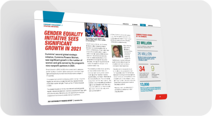 2021 SUSTAINABILITY PROGRESS REPORT | Cummins Inc. 39 In Ghana, Cummins partners with Camfed to help disadvantaged young women from rural backgrounds navigate the post-school period and transition to further education, employment or entrepreneurship. Doris Afanyedey (left), General Manager of Cummins Ghana, helped launch a Cummins mentorship program for Camfed alumni. Cummins employees guide Camfed students through their educational and career journeys by sharing work related experiences. Afanyedey mentors because she feels it is her calling to help young women reach their full potential. One of her mentees was interested in nursing, so she encouraged the woman to create a vision board based on her educational and professional goals. It was a great way to establish objectives and identify areas where the young woman could use Afanyedey’s guidance. “When you mentor, you allow people to see that they can do so much more,” Afanyedey added. In North America, Girls Inc. and Cummins developed a direct mentoring program between nine Cummins leaders and nine Girls Inc. affiliate leaders. These relationships enabled the nonprofit leaders to explore career challenges, goals and development needs with senior Cummins executives. Girls Inc. leaders benefited from a fresh perspective on management issues like delegation, strategy setting, personnel and finance. The experience was positive for Cummins leaders, too. “The mentoring provides me an opportunity not only to share what we do but also challenge myself on why we do some of the things we do,” said Brian Mormino, Cummins Executive Director – Technical and Environmental Systems. “I am learning right alongside her and then adjusting what I do in Cummins. We are truly rolling up our sleeves together. Our discussions also force me to slow down and reflect on things I normally don’t make time for. In this way, we are both growing together.” GENDER EQUALITY INITIATIVE SEES SIGNIFICANT GROWTH IN 2021 Cummins’ second global strategic initiative, Cummins Powers Women, saw significant growth in the number of women and girls served by the program’s nine nonprofit partners in 2021. Since its launch in 2018, this $22 million commitment to advancing gender equality in Cummins’ global communities has enabled equal rights and opportunity for more than 946,000 women and girls in 17 countries. The program has funded 253 advocacy grants resulting in 34 gender equality law and policy changes that positively impacted the lives of 26 million women and girls. That is up from 17 million impacted in 2020. The program focuses on the four main drivers to achieving gender equality: educational attainment, economic empowerment, legal rights and personal safety. Mentoring was one opportunity for employee engagement that remained possible during the pandemic. CUMMINS POWERS WOMEN BY THE NUMBERS 22 MILLION Cummins commitment in dollars behind the program since it launched in 2018. 26 MILLION Number of women and girls positively impacted by the program, up from 1.6 million in 2018. Cummins employees and nonprofit leaders attend a Cummins Powers Women supported event in South Africa. 13,000 Women on a path to economic independence since 2018 through programs supported by Cummins Powers Women. Gender equality law and policy changes as part of Cummins Powers Women since 2018. 34 Nonprofit partners supported by Cummins Powers Women. 9 COMMUNITY ENGAGEMENT // STRATEGIC INITIATIVES