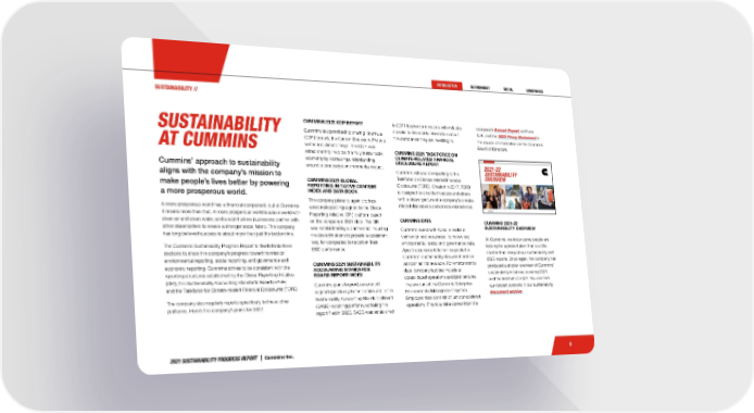 2021 SUSTAINABILITY PROGRESS REPORT | Cummins Inc. 6 company’s Annual Report on Form 10K, and the 2022 Proxy Statement is the source of information on the Cummins Board of Directors. CUMMINS 2021-22 SUSTAINABILITY OVERVIEW At Cummins, we know some people are looking for a presentation that is a little shorter than many of our sustainability and ESG reports. Once again, the company has produced a shorter overview of Cummins’ sustainability initiatives covering 2021 and the first half of 2022. You can find our newest overview in our sustainability document archive . in 2011 to provide investors with industry- specific sustainability information about the companies they are investing in. CUMMINS 2021 TASK FORCE ON CLIMATE-RELATED FINANCIAL DISCLOSURE REPORT Cummins will also be reporting to the Taskforce on Climate-related Financial Disclosures (TCFD). Created in 2017, TCFD is designed to provide investors and others with a clearer picture of a company’s climate- related disclosures and climate-related risks. CUMMINS DATA Cummins works with Apex, a leader in verification and assurance, to review key environmental, social and governance data. Apex’s assurance letter will be posted in Cummins’ sustainability document archive as soon as it is available. For environmental data, company facilities include all consolidated operations and joint ventures that are part of the Cummins Enterprise Environmental Management System. Employee data consists of just consolidated operations. Financial data comes from the CUMMINS 2022 CDP REPORT Cummins is committed to sharing its annual CDP (formerly the Carbon Disclosure Project) water and climate filings. The CDP was established to help build a truly sustainable economy by increasing understanding around a company’s environmental impact. CUMMINS 2021 GLOBAL REPORTING INITIATIVE CONTENT INDEX AND DATA BOOK The company plans to again produce a separate posting aligned to the Global Reporting Initiative (GRI) platform based on the company’s 2021 data. The GRI was established by a partnership including the United Nations to provide a consistent way for companies to report on their ESG performance. CUMMINS 2021 SUSTAINABILITY ACCOUNTING STANDARDS BOARD REPORT INDEX Cummins plans to produce a report aligned specifically to the disclosures in the Sustainability Accounting Standards Board (SASB) reporting platform, updating the report filed in 2020. SASB was established SUSTAINABILITY AT CUMMINS Cummins’ approach to sustainability aligns with the company’s mission to make people’s lives better by powering a more prosperous world. A more prosperous world has a financial component, but at Cummins it means more than that. A more prosperous world is also a world with clean air and clean water, and a world where businesses partner with other stakeholders to weave a stronger social fabric. The company has long believed success is about more than just the bottom line. The Cummins Sustainability Progress Report is divided into three sections to show the company’s progress toward its mission: environmental reporting, social reporting, and governance and economic reporting. Cummins strives to be consistent with the reporting structures established by the Global Reporting Initiative (GRI), the Sustainability Accounting Standards Board (SASB) and the Taskforce for Climate-related Financial Disclosures (TCFD). The company also regularly reports specifically to these other platforms. Here’s the company’s plans for 2022: 2021-22 SUSTAINABILITY OVERVIEW Cummins Inc. SUSTAINABILITY //