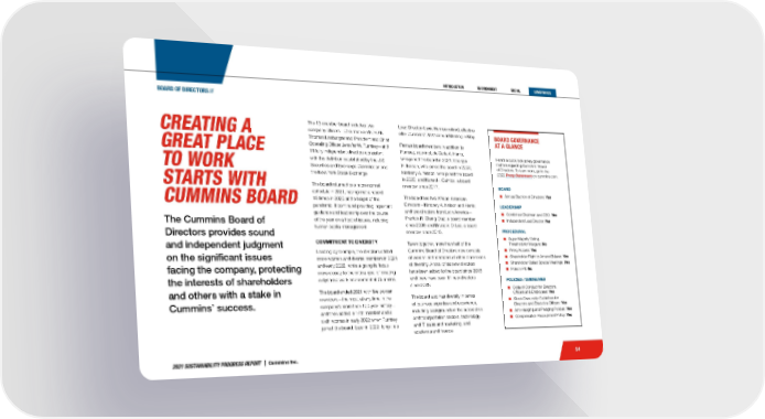 2021 SUSTAINABILITY PROGRESS REPORT | Cummins Inc. 54 Lead Director Alexis Herman retired, effective after Cummins’ 2022 Annual Meeting in May. Female board members in addition to Rumsey, now include Carla A. Harris, who joined the board in 2021; Georgia R. Nelson, who joined the board in 2004; Kimberly A. Nelson. who joined the board in 2020; and Karen H. Quintos, a board member since 2017. The board has two African American Directors—Kimberly A. Nelson and Harris; and two directors from Latin America— Franklin R. Chang Diaz, a board member since 2009, and Bruno V. Di Leo, a board member since 2015. Taken together, more than half of the Cummins Board of Directors now consists of women and members of other dimensions of diversity. A total of six new directors have been added to the board since 2015 and there have been 11 new directors since 2008. The board also has diversity in terms of business expertise and experience, including backgrounds in the automotive and transportation sectors, technology and IT, sales and marketing, and academia and finance. The 13-member board includes two company officers—Chairman and CEO N. Thomas Linebarger and President and Chief Operating Officer Jennifer W. Rumsey—and 11 fully independent directors consistent with the definition established by the U.S. Securities and Exchange Commission and the New York Stock Exchange. The board returned to a more normal schedule in 2021, having met a record 15 times in 2020 at the height of the pandemic. It continued providing important guidance and leadership over the course of the year on a host of issues, including human capital management. COMMITMENT TO DIVERSITY Leading by example, the directors added more women and diverse members in 2021 and early 2022, while aligning its focus more closely to the critical goal of creating a dynamic work environment at Cummins. The board ended 2021 with five women members—the most at any time in the company’s more than 100-year history— and then added a 14th member and a sixth woman in early 2022 when Rumsey joined the board. Later in 2022, long-time CREATING A GREAT PLACE TO WORK STARTS WITH CUMMINS BOARD The Cummins Board of Directors provides sound and independent judgment on the significant issues facing the company, protecting the interests of shareholders and others with a stake in Cummins’ success. BOARD GOVERNANCE AT A GLANCE Here’s a quick look at key governance matters regarding Cummins’ Board of Directors. To learn more, go to the 2022 Proxy Statement on cummins.com. BOARD Annual Election of Directors: Yes LEADERSHIP Combined Chairman and CEO: Yes Independent Lead Director: Yes PROCEDURAL Super Majority Voting Threshold for Mergers: No Proxy Access: Yes Shareholder Right to Amend Bylaws: Yes Shareholder Called Special Meetings: Yes Poison Pill: No POLICIES / GUIDELINES Code of Conduct for Directors, Officers and Employees: Yes Stock Ownership Guidelines for Directors and Executive Officers: Yes Anti-Hedging and Pledging Policies: Yes Compensation Recoupment Policy: Yes BOARD OF DIRECTORS //