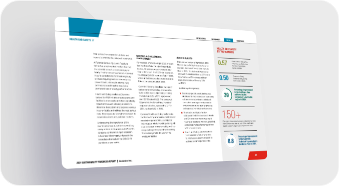2021 SUSTAINABILITY PROGRESS REPORT | Cummins Inc. 43 2021 HIGHLIGHTS There were a number of highlights in 2021. The Contractor Safety Incidence Rate, for example, decreased from 0.63 in 2020 to 0.50 in 2021. The Technical Organization improved its Incidence Rate by 8.8% while Asia-Pacific and China improved their respective Incidence Rates by 39% and 32%. In other key developments: Supervisor specific safety training was developed to help cultivate an ideal safety culture where supervisors understand their role in creating an environment in which employees feel safe to speak up and express their ideas and concerns. The Health and Safety function collaborated with the company’s Health and Wellness team to develop a pilot training on emotional wellness, providing employees the tools to manage stress within the workplace. Health and Safety also worked with the Global Manufacturing function to introduce collaborative robots to address certain ergonomic risks. MEETING A CHALLENGING ENVIRONMENT For example, after achieving in 2020 a record low Incidence Rate, the rate of recordable injuries, Cummins saw an increase in 2021 from 0.48 to 0.57. The 2021 rate was below the company’s 0.59 Incidence Rate in 2019, which at that time was the lowest Incidence Rate at the company since 2015. Cummins’ Severity Case Rate, the rate of lost or restricted workdays, increased to 0.28 in 2021 from 0.21 in 2020. In 2019, the rate was 0.23, a 15% improvement over 2018’s rate of 0.26. The company’s Ergonomics Incidence Rate, the rate of ergonomic injuries, increased to 0.17 in 2021, up from 0.12 in 2020. Cummins’ Health and Safety leaders note that the fourth quarter contributed the fewest recordable injuries in 2021, an indication that mitigation efforts, including working with sites to maintain a focus on safety amid the many challenges they faced, were working. The company ended the year with no employee fatalities. from across the company’s functions and regions to promote the initiative’s importance. A Potential Serious Injury and Fatality is defined as a work-related incident that had the potential to lead to a serious injury or fatality if not for one or two factors. A serious injury is considered a life threatening injury or illness requiring medical intervention to prevent death, while a life altering injury or illness is something that results in a permanent loss of a body part or function. Health and Safety leaders at Cummins believe the PSIF initiative enables plants and facilities to more easily and effectively identify, report and evaluate all safety incidents to determine their potential to become a serious injury or fatality and address the most serious risks. Employees are strongly encouraged to report all incidents and potential incidents. Underscoring the importance of this new initiative was an uptick in several key safety metrics at Cummins in 2021 as the company confronted a rapid escalation in business following shut-downs in the immediate aftermath of the COVID-19 pandemic a year earlier. HEALTH AND SAFETY BY THE NUMBERS 150+ Ergonomic improvement projects submitted by more than 60 Cummins sites as part of the Health and Safety function’s Ergo Cup competition in 2021. 0.57 39 Percentage improvement in the Incidence Rate achieved by the company’s Asia-Pacific region in 2021. 8.8 Percentage improvement in the Cummins Technical Organization’s Incidence Rate in 2021. The Incidence Rate at the company, up slightly from the rate of recordable injuries in 2020. 0.50 Contractor Safety Incidence Rate, a drop from 0.630 in 2020. HEALTH AND SAFETY //