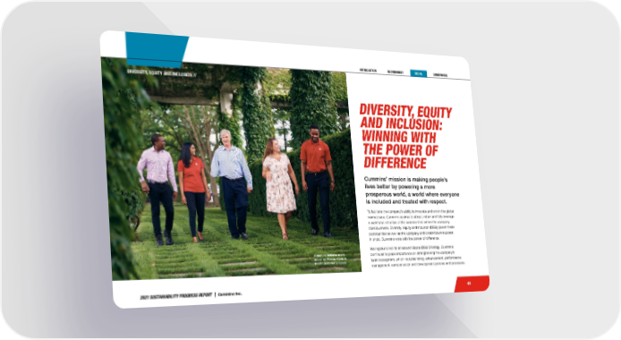 2021 SUSTAINABILITY PROGRESS REPORT | Cummins Inc. 46 DIVERSITY, EQUITY AND INCLUSION: WINNING WITH THE POWER OF DIFFERENCE Cummins’ mission is making people’s lives better by powering a more prosperous world, a world where everyone is included and treated with respect. To facilitate the company’s ability to innovate and win in the global marketplace, Cummins aspires to attract, retain and fully leverage a workforce reflective of the communities where the company does business. Diversity, equity and inclusion (DE&I) power these communities as well as the company and create future success. In short, Cummins wins with the power of difference. Having launched its enhanced Global DE&I Strategy, Cummins continues to place importance on strengthening the company’s talent ecosystem, which includes hiring, advancement, performance management, compensation and development policies and processes. Cummins believes in the power of diverse teams to power customer success. DIVERSITY, EQUITY AND INCLUSION //