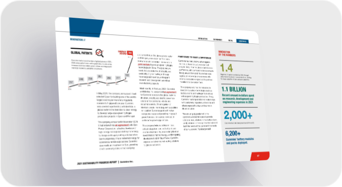 2021 SUSTAINABILITY PROGRESS REPORT | Cummins Inc. INNOVATION BY THE NUMBERS 67 1.4 Gigatons of carbon avoided by 2035 through advances in Cummins’ core products vs. waiting for mass adoption of zero emission platforms. 1.1 BILLION Record amount in dollars spent on research, development and engineering expenses in 2021. 2,000+ Cummins fuel cells deployed around the world. 6,200+ Cummins’ battery modules and packs deployed. POSITIONED TO MAKE A DIFFERENCE Cummins has many distinct advantages in the drive to decarbonize, Linebarger told analysts. First, it has the global reach to make a difference, with plants and a service network literally around the world. No one has more application knowledge or experience with internal combustion engines as the platform transitions to low-carbon fuels. The company also has the resources to invest in no-carbon technologies such as battery-electric and hydrogen fuel cells as well as green hydrogen production. Finally, Cummins has long-established relationships with customers, regulators, universities and others expected to play a critical role in decarbonization. “We are uniquely positioned in the commercial-industrial space to provide solutions now, solutions in the medium-term, (and) solutions in the long-term that will meet both the needs of the planet and the needs of our customers,” Linebarger said. Just a month later, the global power leader and Sinopec, also known as the China Petrochemical Corporation, announced a joint venture to produce green hydrogen technologies in China. The joint venture wants to accelerate the affordability and availability of green hydrogen through technological innovation, and expand research and development as well as manufacturing capacity. Most recently, in February 2022, Cummins and Meritor, Inc. announced an agreement for Cummins to acquire the global leader in drivetrain, mobility and electric powertrain solutions for commercial vehicle and industrial markets. The integration of Meritor’s people, technology and capabilities will position Cummins as one of the few companies capable of providing integrated powertrain solutions across combustion and electric power applications. The company believes eAxles will be a critical integration point within hybrid and electric drivetrains. By accelerating Meritor’s investment in this technology, and integrating development within New Power, Cummins expects to deliver market-leading solutions to global customers. In May 2021, the company announced it had selected Spain for building one of the world’s largest electrolyzer manufacturing plants, scalable to 1 gigawatt per year. Cummins also unveiled a partnership with Iberdrola, a global leader in the transition to clean energy, to develop large-scale green hydrogen production projects in Spain and Portugal. The company announced in November 2021 it had entered into an agreement with Sion Power Corporation, a leading developer of high-energy rechargeable battery technology, to design and supply battery cells based on Sion’s proprietary lithium metal technology for commercial vehicle applications. Cummins also made an investment in Sion, providing it with a minority stake in that company. 2021 564 2018 264 2017 287 2016 259 2015 249 2014 217 2019 277 COMPANY RECORD GLOBAL PATENTS Cummins had a record number of global patents in 2021. While every patent starts with a great idea, the size of the increase could also reflect patent offices catching up with backlogs caused by pandemic shutdowns. 2020 312 INNOVATION //