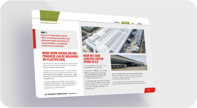 2021 SUSTAINABILITY PROGRESS REPORT | Cummins Inc. ENVIRONMENTAL PROGRESS // 26 MORE WORK NEEDED BEFORE PROGRESS CAN BE MEASURED ON PLASTICS GOAL This 2030 goal is still largely in the planning phase. Opportunities for progress have been identified, but more work is necessary before metrics are available to measure progress. A key action under discussion is the use of universally recyclable packaging content and eliminating problematic materials such as foam and mixed material packaging. This step, however, requires partnerning with suppliers on design and material selection and is a longer-term effort. The single-use plastics part of the goal has been limited in its progress during the pandemic, as many employees had not yet returned to their work locations in 2021 and the focus of site facility staff was on pandemic protocols. GOAL 7: Reuse or responsibly recycle 100% of packaging plastics and eliminate single-use plastics in dining facilities, at employee events and as amenities. NEAR NET ZERO LOGISTICS CENTER OPENS IN U.K A new Cummins logistics hub in Daventry, U.K., is being praised for its energy efficiency. The company’s United Kingdom Logistics Centre (UKLC), which opened in 2021, has been given a BREEAM Outstanding rating, a sustainability assessment ranking the facility in the top 1% of non-domestic buildings in the U.K. The UKLC is designed to be self-powered for half of the year, utilizing photo-voltaic solar panels on its roof capable of generating up to 1,472 kilowatts (kWp) and a Cummins QSK60G gas generator set in a standby application. Other environmentally focused features include the site’s ability to harvest rainwater and available electric vehicle charging stations for employees. The project also supported local businesses, using suppliers from within a 15-mile radius throughout construction. The developer offset the embodied carbon during the construction phase by participating in an effort to safeguard approximately 330 acres of rainforest.