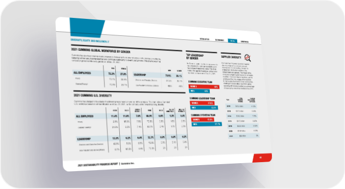 2021 SUSTAINABILITY PROGRESS REPORT | Cummins Inc. 48 TOP LEADERSHIP BY GENDER As Cummins works to attract more women to the company, it is putting a special focus on the company’s leadership ranks. This chart looks at the gender breakdown of Cummins’ top executive teams as of Dec. 31, 2021: SUPPLIER DIVERSITY For more than 40 years, Cummins’ supplier diversity program has spread economic development to communities through the engagement of diverse suppliers in the United States and globally. The impact of the company’s program goes beyond its immediate suppliers. Cummins’ diverse suppliers, and the employees they hire, engage other suppliers in their supply chains and in their communities, creating a multiplier effect. Cummins’ global spending with diverse suppliers as a percentage of revenue has more than doubled since 2010. 2021 CUMMINS U.S. DIVERSITY Cummins has pledged to be a leader in addressing racial inequity in and out of the company. This chart looks at Cummins’ U.S. workforce based on self-identification as of Dec. 31, 2021, as the company works toward improving diversity. ASIAN BLACK LATINX / HISPANIC WHITE OTHER TWO OR MORE RACES DECLINED TO ANSWER ALL EMPLOYEES 11.4% 11.6% 7.6% 66.9% 0.6% 1.5% 0.4% Hourly 2.5% 15.9% 7.8% 70.8% 0.8% 1.8% 0.5% Salaried / exempt 21.9% 6.6% 7.4% 62.2% 0.4% 1.2% 0.3% LEADERSHIP 13.3% 6.2% 6.4% 72.7% 0.5% 0.8% 0.2% Directors and Executive Directors 13.5% 5.9% 6.5% 72.6% 0.5% 0.9% 0.2% Vice President and above (officers) 6.7% 15.6% 4.4% 73.3% 0% 0% 0% 2021 CUMMINS GLOBAL WORKFORCE BY GENDER Cummins has also been making steady progress on increasing the number of women in the company’s workforce, believing women are underrepresented and contribute significantly to diversity at Cummins. This chart looks at the company’s global workforce by gender as of Dec. 31, 2021. MEN WOMEN ALL EMPLOYEES 72.2% 27.8% Hourly 73.1% 26.9% Salaried/Exempt 70.9% 29.1% MEN WOMEN LEADERSHIP 73.9% 26.1% Directors and Executive Directors 74.3% 25.7% Vice President and above (officers) 60% 40% DIVERSITY, EQUITY AND INCLUSION // 42.9% CUMMINS EXECUTIVE TEAM MEN WOMEN 60% 40% CUMMINS LEADERSHIP TEAM MEN WOMEN 47.6% 52.4% CUMMINS OPERATING TEAM MEN WOMEN 57.1% YEAR TOTAL CUMMINS REVENUE % SPEND WITH DIVERSE SUPPLIERS 2010 $13.2 billion 4.12% 2012 $17.3 billion 5.45% 2014 $19.2 billion 7.76% 2016 $17.5 billion 8.80% 2018 $23.8 billion 8.65% 2020 $19.8 billion 8.03% 2021 $24 billion 9%