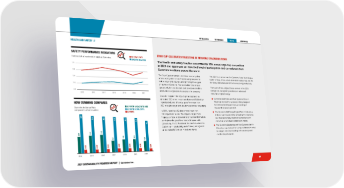 2021 SUSTAINABILITY PROGRESS REPORT | Cummins Inc. 0 8 ERGO CUP CELEBRATES MILESTONE IN REDUCING ERGONOMIC RISKS The Health and Safety function celebrated its 10th annual Ergo Cup competition in 2021 and again saw an increased level of participation and commitment from Cummins locations around the world. The Ergo Cup is a competition where company sites enter a variety of initiatives they have implemented to reduce ergonomic injuries, among the top three types of injuries at Cummins. The competition presents an opportunity for sites to share best practices and drive a reduction in ergonomic risks across the company. Since its inception, the Ergo Cup has captured an estimated $50 million in cost avoidance and $13 million in productivity and efficiency gains from more than 900 innovative ergonomic solutions submitted for judging. In 2021, more than 60 sites entered more than 150 projects for review. The projects ranged from finger push force improvements to hammer eliminations to initiatives designed to eliminate dangerous lifts. Collectively, the 2021 entrants delivered an estimated $3.8 million in productivity and efficiency savings and an estimated $13 million in cost avoidance. The 2021 cup winner was the Cummins Turbo Technologies facility in Wuxi, China, which eliminated multiple high-risk lifts for nearly 300 turbos per shift while improving productivity. There were three Judges Choice winners in the 2021 competition, recognizing excellence in advanced manufacturing technology: Cummins Electronics and Fuel Systems China in Wuxi was honored for automatic kitting designed to eliminate bending and manual handling of thousands of pieces per shift. The Cummins Mid-Range Engine Plant in Columbus, Indiana, was recognized for mitigating the ergonomic risk from some highly repetitive workstations with more than a half-dozen collaborative robots. The Cummins Electronics and Fuel Systems plant in Columbus was honored for using a collaborative robot to mitigate risks from loading and unloading some needle shaped objects. 44 HOW CUMMINS COMPARES Cummins Incidence Rate compared to other industries: CUMMINS US MOTOR & GENERATOR MFG US MOTOR VEHICLE MFG SAFETY PERFORMANCE INDICATORS Here’s a look at key trends in safety at Cummins. 2015 2016 2017 2018 2019 2020 2021 0.0 0.2 0.4 0.6 0.8 1.0 SEVERITY CASE RATE INCIDENCE RATE 0.61 0.59 0.63 0.65 0.59 0.48 0.69 2020 2019 2018 2017 2016 2015 2014 HEALTH AND SAFETY // 2.9 3.1 3.2 2.3 2.3 1.9 2.1 6.9 6.6 6.5 6.3 6.2 5.7 6.4
