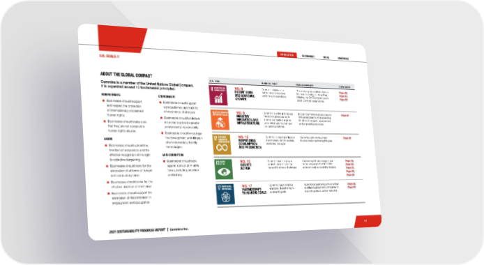 2021 SUSTAINABILITY PROGRESS REPORT | Cummins Inc. 11 U.N. GOAL CUMMINS’ ROLE STATUS SUMMARY LEARN MORE NO. 8 DECENT WORK AND ECONOMIC GROWTH Cummins’ mission is to build a more prosperous world for all stakeholders. The company has multiple efforts in this area, including its Living Wage initiative, the CARE program and in 2021 Cummins Water Works. Page 40, Page 41, Page 50 NO. 9 INDUSTRY INNOVATION AND INFRASTRUCTURE Cummins is working to reduce the carbon produced by its internal combustion engines while bringing to market new no-carbon platforms. In 2021 Cummins received a record 564 global patents while exceeding $1 billion in research, development and engineering expenses. Page 67 NO. 12 RESPONSIBLE CONSUMPTION AND PRODUCTION Cummins is creating a lifecycle plan for every part to use less, use better, use again. Cummins took two key steps foundational to achieving this goal. Page 24 NO. 13 CLIMATE ACTION Cummins wants to play a leadership role in meeting the world’s climate challenges. Addressing climate change is part of the company’s PLANET 2050 environmental sustainability strategy. Page 19, Page 20, Page 21, Page 22, Page 23 NO. 17 PARTNERSHIPS TO ACHIEVE GOALS Cummins has numerous examples of partnering to achieve its goals. Cummins is partnering with a number of different groups and companies to reach its goals on carbon reduction. Page 32, Page 68 ABOUT THE GLOBAL COMPACT Cummins is a member of the United Nations Global Compact. It is organized around 10 fundamental principles: HUMAN RIGHTS Businesses should support and respect the protection of internationally proclaimed human rights. Businesses should make sure that they are not complicit in human rights abuses. LABOR Businesses should uphold the freedom of association and the effective recognition of the right to collective bargaining. Businesses should work for the elimination of all forms of forced and compulsory labor. Businesses should strive for the effective abolition of child labor. Businesses should support the elimination of discrimination in employment and occupation. ENVIRONMENT Businesses should support a precautionary approach to environmental challenges. Businesses should undertake initiatives to promote greater environmental responsibility. Businesses should encourage the development and diffusion of environmentally friendly technologies. ANTI-CORRUPTION Businesses should work against corruption in all its forms, including extortion and bribery. U.N. GOALS //