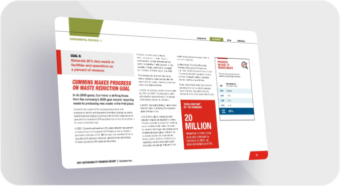 2021 SUSTAINABILITY PROGRESS REPORT | Cummins Inc. 25 YEAR WASTE REDUCTION (% intensity change) 2018 Baseline 2019 1.9% 2020 2.6% 2021 4.1% 2030 GOAL 25% PROGRESS ON GOAL TO REDUCE WASTE This table looks at total Cummins waste as a percentage of revenue. ENVIRONMENTAL PROGRESS // and by deploying modular engine skids for customer shipments. Looking ahead, Cummins’ Returnable Packaging Management Program has significant investments planned over the next five years in returnable packaging, tracking software, third party logistics, packaging services, warehousing, and more. These improvements will be instrumental to achieving 78 million pounds of packaging waste reduction, helping the company achieve its overall 2030 waste reduction goal. However, Cummins saw packaging waste increase by 3.3 million pounds, a 2% absolute increase. Process-derived waste increased by 7 million pounds, a 10% absolute increase, and e-waste increased by 1.6 million, 3.75 times larger than 2018. The company has launched initiatives to reduce packaging waste, process-derived waste (such as used oil, coolants, paints and solvents) and general refuse. In 2021, the company reduced general waste by 15% from 2018. This reduction is mainly attributed to closures of most office spaces and cafeterias due to the pandemic. Cummins’ packaging strategy has laid out an important path to achieving the company’s goals and aspirations. In 2022 alone, global packaging waste reduction projects are expected to reduce 1.3 million pounds of waste while providing a cost avoidance of $3 million. Cummins will achieve this through intercompany reuse of expendable packaging, implementing returnable solutions for engine blocks, battery packs and other prioritized parts; expanding leased and supplier owned returnable packaging in India and China; CUMMINS MAKES PROGRESS ON WASTE REDUCTION GOAL In its 2030 goals, Cummins is shifting focus from the company’s 2020 goal around recycling waste to producing less waste in the first place. Cummins has examined the company’s processes and practices to identify and implement immediate changes as well as transformational projects to achieve both its 2030 waste reduction goal and the company’s 2050 aspiration to use natural resources in the most sustainable way. In 2021, Cummins achieved a 4.1% waste reduction as a percent of revenue from the company’s 2018 baseline and an absolute generation reduction of 3%. Metal scrap decreased by 20 million pounds (a 8% absolute reduction), general refuse declined by 8 million pounds (a 15% absolute reduction). GOAL 6: Generate 25% less waste in facilities and operations as a percent of revenue. DOING OUR PART BY THE NUMBERS 20 MILLION Reduction in metal scrap in pounds achieved by Cummins in 2021, an absolute reduction of 8%.