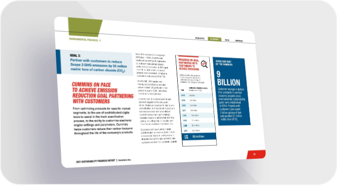 2021 SUSTAINABILITY PROGRESS REPORT | Cummins Inc. 22 YEAR CUMULATIVE EMISSION REDUCTION (in metric tons of CO 2 ) 2014 Baseline 2015 2.3 million 2016 5.2 million 2017 8.6 million 2018 12.9 million 2019 17.4 million 2020 22.1 million 2021 26.8 million 2030 GOAL 55 million PROGRESS ON GOAL PARTNERING WITH CUSTOMERS TO REDUCE EMISSIONS This table looks at progress on Cummins’ goal to partner with customers to reduce Scope 3 emissions from products in the field. ENVIRONMENTAL PROGRESS // DOING OUR PART BY THE NUMBERS 9 BILLION Customer savings in dollars from products in use fuel economy projects since environmental sustainability goals were established in 2014. Projects with customers also saved 3 billion gallons of fuel and avoided 27 million metric tons of CO 2 . Since first surpassing the company’s 2020 goal in 2018, Cummins has continued partnering with customers to implement fuel savings projects and is on track to exceed its 2030 goal. In 2021, an additional 50 customer projects were completed, bringing the cumulative total since 2014 to 700. The PLANET 2050 goal is now formally expressed as a cumulative carbon dioxide (CO 2 ) reduction since a baseline year of 2014, rather than the annual run rate achieved. Cummins and its customer partnerships achieved big gains in the early years of this initiative as projects with high returns were identified and completed. As products have become more and more efficient, Cummins is now tackling increasingly complex projects to achieve fuel economy savings, including route optimization and the introduction of lower emissions fuels. Customers continue to show interest and dedication to improving their product environmental footprint, and Cummins is dedicated to continuing to partner to help customers achieve their sustainability goals. CUMMINS ON PACE TO ACHIEVE EMISSION REDUCTION GOAL PARTNERING WITH CUSTOMERS From optimizing products for specific market segments, to the use of sophisticated digital tools to assist in the truck specification process, to the ability to customize electronic engine settings and parameters, Cummins helps customers reduce their carbon footprint throughout the life of the company’s products. GOAL 3: Partner with customers to reduce Scope 3 GHG emissions by 55 million metric tons of carbon dioxide (CO 2 ).