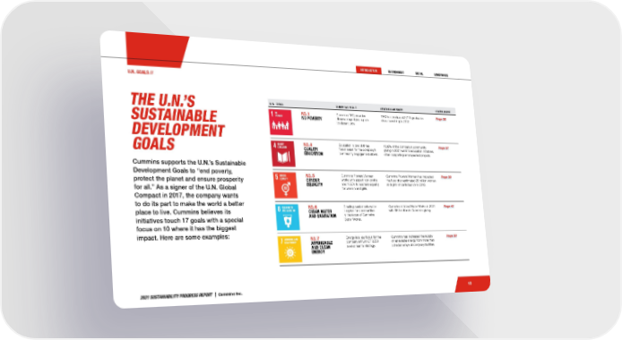 2021 SUSTAINABILITY PROGRESS REPORT | Cummins Inc. 10 THE U.N.’S SUSTAINABLE DEVELOPMENT GOALS Cummins supports the U.N.’s Sustainable Development Goals to “end poverty, protect the planet and ensure prosperity for all.” As a signer of the U.N. Global Compact in 2017, the company wants to do its part to make the world a better place to live. Cummins believes its initiatives touch 17 goals with a special focus on 10 where it has the biggest impact. Here are some examples: U.N. GOAL CUMMINS’ ROLE STATUS SUMMARY LEARN MORE NO. 1 NO POVERTY Cummins TEC provides disadvantaged you a path to decent jobs. TEC has produced 2,713 graduates since launching in 2012. Page 38 NO. 4 QUALITY EDUCATION Education is one of three focus areas for the company’s community engagement efforts. 12.9% of the company’s community giving in 2021 went to education initiatives, often supporting employee led projects. Page 37 NO. 5 GENDER EQUALITY Cummins Powers Women works with expert non-profits and NGOs to address equality for women and girls. Cummins Powers Women has impacted the lives of an estimated 26 million women and girls since its launch in 2018. Page 39 NO. 6 CLEAN WATER AND SANITATION Creating sustainable water supplies for communities is the focus of Cummins Water Works. Cummins initiated Water Works in 2021 with $8.5 million in Cummins giving. Page 41 NO. 7 AFFORDABLE AND CLEAN ENERGY Energy is a key focus for the company’s PLANET 2050 environmental strategy. Cummins has increased the supply of renewable energy from more than 50 solar arrays at company facilities. Page 30 U.N. GOALS //