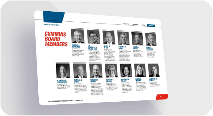 2021 SUSTAINABILITY PROGRESS REPORT | Cummins Inc. 56 CUMMINS BOARD MEMBERS CARLA A. HARRIS Senior Client Advisor, Morgan Stanley, a global leader in investment banking and financial services. Harris, 59, joined the board in 2021. DR. FRANKLIN R. CHANG DIAZ Founder, Chairman and Chief Executive Officer of Ad Astra Rocket Company, a U.S. spaceflight engineering company based in Houston, Texas. Chang Diaz, 71, joined the board in 2009. ROBERT J. BERNHARD Vice President for Research and a Professor of Engineering at the University of Notre Dame. Bernhard, 69, joined the board in 2008. BRUNO V. DI LEO Retired Senior Vice President, IBM Corporation, a global technology and consulting company. Currently, Managing Director of Bearing-North, LLC, an independent advisory firm. Di Leo, 65, joined the board in 2015. STEPHEN B. DOBBS Retired Senior Group President at Fluor Corporation, a Fortune 500 company offering engineering, procurement, construction, maintenance, and project management services on a global basis. Dobbs, 65, joined the board in 2010. KIMBERLY A. NELSON Retired Senior Vice President, External Relations, at General Mills Inc., a world leading manufacturer of branded consumer food products. Nelson, 59, joined the board in 2020. THOMAS J. LYNCH Chairman of TE Connectivity Ltd., a global provider of connectivity and sensor solutions. Lynch, 67, joined the board in 2015 and became Lead Director in 2022. N. THOMAS LINEBARGER Chairman and Chief Executive Officer, Cummins Inc. Linebarger, 59, joined the board in 2009. WILLIAM I. MILLER President of The Wallace Foundation, a national philanthropy with a mission of fostering equity and improvements in learning and enrichment for young people and in the arts for everyone, since 2011. Miller, 65, joined the Cummins board in 1989. GEORGIA R. NELSON Retired President and Chief Executive Officer of PTI Resources, LLC, an independent consulting firm. Nelson, 72, joined the board in 2004. KAREN H. QUINTOS Retired Chief Customer Officer of Dell Technologies Inc., a global supplier of personal computers and other computer hardware items. Quintos, 58, joined the board in 2017. ROBERT K. HERDMAN Managing Director of Kalorama Partners, LLC, a Washington, D.C.- based consulting firm. Herdman, 73, joined the board in 2008. JENNIFER W. RUMSEY President and Chief Operations Officer, Cummins Inc. Rumsey, 48, joined the board in 2022. BOARD OF DIRECTORS //