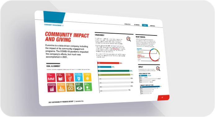 2021 SUSTAINABILITY PROGRESS REPORT | Cummins Inc. 37 0 100 200 300 400 500 600 253 2017 2017 COMMUNITY IMPACT AND GIVING Cummins is a data-driven company, including the impact of its community engagement programs. The COVID-19 pandemic impacted the company’s efforts, but much was accomplished in 2021. COMMUNITY ENGAGEMENT // GOAL ALIGNMENT Cummins’ community engagement initiatives align with these U.N. Sustainable Development Goals: ENGAGEMENT One of Cummins’ chief metrics for community engagement is employee participation in Cummins’ Every Employee Every Community (EEEC) program, which enables employees to use at least four work hours to volunteer in their communities. In-person employee volunteerism remained limited in 2021 due to the COVID-19 pandemic, so employees found innovative ways to volunteer safely. Projects included writing letters to the elderly, packing meals for children, providing virtual tours of Cummins facilities for young students and more. In all, almost 40,000 employees participated in the EEEC program in 2021 by volunteering more than 186,000 hours with nonprofits around the world. 56% 35% 2021 GRANT MAKING Global community giving reached a new record in 2021, totaling $35.7 million, a 62% increase from 2020. COVID-19 emergency grants continued, and by the end of 2021, grants had been given to 119 organizations around the world totaling more than $3.5 million. Here’s a look at 2021 grantmaking by priority area: IMPACT People served and the number of community grants both increased in 2021 from 2020 levels: 2020 2019 2018 2016 2015 2014 82% 83% 82% 82% 80% 73% EDUCATION 12.9% ENVIRONMENT 23.9% EQUALITY OF OPPORTUNITY 49.2% OTHER 14% PEOPLE SERVED (BY YEAR) COMMUNITY GRANTS (BY YEAR) 0 1 2 3 4 5 6 7 8 3 MILLION 2021 1.4 MILLION 6.5 MILLION 4.3 MILLION 3.3 MILLION 2020 2019 2018 562 2021 463 326 311 2020 2019 2018 2017