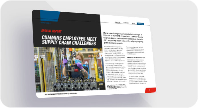 2021 SUSTAINABILITY PROGRESS REPORT | Cummins Inc. 69 The company’s Supply Chain teams total more than 30,000 employees and operate a global network of more than 125 plants, 40 warehouses and a supply base of more than 25,000 suppliers. SUPPORTING RECORD PRODUCTION Global supply chain challenges became widespread toward the start of 2021, disrupting virtually every industry and market, impacting Cummins, its customers and the company’s suppliers. Cummins’ ability to continue navigating the ongoing challenges driven by COVID-19, while also addressing these new challenges, is a testament to employees across the organization. The ability of Cummins’ Supply Chain organization to work collaboratively was critical, as each function brought unique skills that enabled the company to maintain operations at Cummins’ manufacturing SPECIAL REPORT CUMMINS EMPLOYEES MEET SUPPLY CHAIN CHALLENGES After a year of navigating unprecedented challenges in 2020 due to the COVID-19 pandemic, Cummins’ Supply Chain employees continued their tremendous efforts in 2021, supporting record sales while navigating ongoing global supply constraints. The complex combination of pandemic- related effects, weather events, fluctuating demand, and disruptions in global parts supplies and transportation impacted most companies, including Cummins. The company’s Supply Chain organization worked around the clock to resolve these challenges, meet customer demand and, most importantly, keep Cummins employees safe. The Cummins Supply Chain organization is responsible for the production and distribution of the company’s broad portfolio of power solutions. It includes Cummins’ Manufacturing; Purchasing; Planning; Logistics; Quality; and Health, Safety and Environment functions, partnering with teams from across the company (Human Resources, Information Technology, Finance, Legal, Communications and more) to ensure the success of Cummins’ global operations. Cummins diversity, equity and inclusion efforts extend to the company’s supply chain where the company is working to attract more women to the manufacturing function. SUPPLY CHAIN //