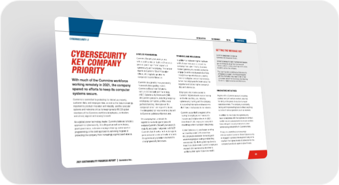 2021 SUSTAINABILITY PROGRESS REPORT | Cummins Inc. GETTING THE MESSAGE OUT Cummins designates October as Cybersecurity Awareness Month. Global Cybersecurity team members and leaders go out and speak about the importance of cybersecurity in a variety of settings and multiple locations across the company. The team has also established a Cybersecurity Ambassador program, providing participants with the information they need to talk to their co-workers about the importance of protecting Cummins’ digital resources and information. 60 INNOVATIVE INITIATIVES Anyone with a Cummins account, including contract and joint venture workers, also has the ability at the press of a button to report suspicious emails. The company is constantly testing and implementing tools to detect anything outside of normal operations such as malware. In addition to new tools, the cybersecurity team collaborates with the business to conduct vendor security assessments to ensure vendors have adequate security measures in place before being entrusted with Cummins data. Finally, in a world that is increasingly interconnected, Cummins Global Cybersecurity is engaged in product development early on to maintain the highest levels of protection for the company’s products against cyber threats. TRAINING AND EDUCATION In addition to implementing the hardware and software necessary to protect the company from cyber threats, Cummins Global Cybersecurity has also worked to engage Cummins employees in its efforts through training and education, starting from revised global onboarding materials, where new employees first learn about the importance of protecting the company’s data and information. Employees who receive access to Cummins’ digital network receive training on the devices they use, including cybersecurity training, and the company is expanding training to employees who don’t have direct access to the network. Cummins expanded its required online training for employees with access to the company’s digital network. In 2021, more than 28,000 employees completed mandatory online training on data privacy. Global Cybersecurity also began sending out monthly emails to the more than 65,000 people enrolled in its training and awareness program testing whether they can successfully identify phishing attempts. Based on actual emails Cummins employees received, the exercise includes links to additional training for those who need it. A SOLID FOUNDATION Cummins Global Cybersecurity starts with a solid foundation, built on 21 separate policies governing different aspects of cybersecurity at the company. The function reports to Cummins’ Chief Information Officer, who regularly updates the company’s Board of Directors. Cummins is aligned to the cybersecurity framework developed by the U.S. Commerce Department’s National Institute of Standards and Technology (NIST) Cybersecurity Framework (CSF). All Cummins personnel, including temporary employees, contractors, and business partners handling information on the company’s behalf, are required to follow the data protection requirements contained in Cummins’ policies and procedures. The company has used outside experts to review its operations and evaluate Cummins Global Cybersecurity’s maturity and goals in alignment with NIST. Cummins benchmarks the function against peer companies and continually enhances its cybersecurity operations to meet the changing security landscape. CYBERSECURITY KEY COMPANY PRIORITY With much of the Cummins workforce working remotely in 2021, the company spared no efforts to keep its computer systems secure. Cummins is committed to protecting its intellectual property, customer data, and employee data, as well as the data increasingly important to product innovation and reliability, and the computer systems and networks critical to keeping nearly 65,000 global members of the Cummins workforce (employees, contractors and others) aligned and moving forward. As a global power technology leader, Cummins believes its holistic approach to cybersecurity, including advanced technologies, good governance, extensive employee training, and innovative programming, is the best approach to achieving its goals of protecting the company from increasingly sophisticated attacks. CYBERSECURITY //