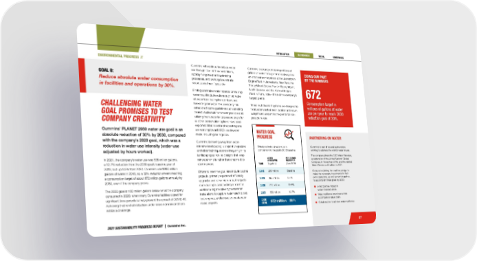 2021 SUSTAINABILITY PROGRESS REPORT | Cummins Inc. YEAR WATER WITHDRAWN (in gallons) PERCENTAGE REDUCTION (from 2018) 2018 960 million Baseline 2019 895 million 6.7% 2020 772 million 19.5% 2021 838 million 12.7% 2030 GOAL 672 million 30% WATER GOAL PROGRESS This table looks at water use in comparison to the goal’s 2018 baseline ENVIRONMENTAL PROGRESS // PARTNERING ON WATER Cummins is part of several partnerships working to address the world’s water issues. The company joined the CEO Water Mandate, an extension of the United Nations’ Global Compact, in November 2019, and the related Water Resilience Coalition in 2021. Companies joining the coalition pledge to make the necessary investments in their own operations, as well as work together, to accomplish three goals by 2050: A net positive impact in water-stressed areas. Water resilience practices across a company’s value chain. Collaboration to achieve water resilience. DOING OUR PART BY THE NUMBERS 672 Consumption target in millions of gallons of water use per year to reach 2030 reduction goal of 30%. 27 Cummins is already conserving millions of gallons of water through three relatively new on-site treatment systems at the Jamestown Engine Plant in Jamestown, New York; the Rocky Mount Engine Plant in Rocky Mount, North Carolina; and the Kothrud Engine Plant in Pune, India—three of the company’s largest plants. These multi-faceted systems are designed to treat water used at each location and return a significant amount to the plants for non- potable re-use. Cummins will continue to reduce water use through low- and no-cost efforts, notably fixing leaks and optimizing processes, and working to eliminate water use in them if possible. Finding alternative water sources or reusing water could include actions such as reuse of water from testing fire sprinklers and harvesting rainwater. The company has established some guidelines such as using treated wastewater whenever possible and utilizing fresh water for processes only after all other conservation options have been explored. Sites in water-stressed regions are working toward 100% wastewater reuse, including for irrigation. Cummins is moving away from water- intensive landscaping, using native grasses and other techniques more frequently in its landscaping as well as designs that keep rainwater on site rather than channel it to storm sewers. Efforts to meet the goal also include capital projects, primarily equipment efficiency upgrades and other high-impact projects such as single-pass cooling elimination, additional regenerative dynamometer installations to capture water used to cool test engines, and innovative wastewater reuse projects. CHALLENGING WATER GOAL PROMISES TO TEST COMPANY CREATIVITY Cummins’ PLANET 2050 water use goal is an absolute reduction of 30% by 2030, compared with the company’s 2020 goal, which was a reduction in water use intensity (water use adjusted by hours worked). In 2021, the company’s water use was 838 million gallons, a 12.7% reduction from the 2030 goal’s baseline year of 2018, but up 8.5% from 2020. Cummins used 960 million gallons of water in 2018, so a 30% reduction means reaching a consumption target of about 672 million gallons annually by 2030, even if the company grows. The 2030 goal is 100 million gallons below what the company consumed in 2020, when many Cummins facilities closed for significant time periods to help prevent the spread of COVID-19. Achieving that kind of reduction under more normal conditions will be a challenge. GOAL 8: Reduce absolute water consumption in facilities and operations by 30%.
