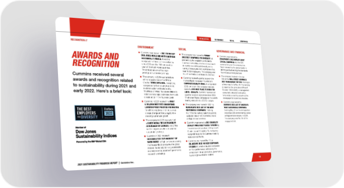2021 SUSTAINABILITY PROGRESS REPORT | Cummins Inc. 16 GOVERNANCE AND FINANCIAL Cummins was named to ETHISPHERE’S 2022 WORLD’S MOST ETHICAL COMPANIES list, the 15th consecutive year the company has been honored by the global leader in defining and advancing the standards for ethical business practices. The company finished in the top 100 of the WALL STREET JOURNAL’S 2021 MANAGEMENT TOP 250 , finishing in a three-way tie for No. 79. The ranking is based on the principles of Peter F. Drucker (1909-2005), a management consultant, educator and author, who wrote a monthly column at the newspaper for some two decades. Cummins was named to BARRON’S 2022 LIST OF AMERICA’S MOST SUSTAINABLE COMPANIES , finishing No. 47 on the list based on more than 200 environmental, social and governance issues. In 2021, the company was No. 84 of the magazine’s list. SOCIAL The company was named to FORBES’ 2022 BEST COMPANIES FOR DIVERSITY list prepared by the magazine and Statista. Cummins ranked No. 4 in the review based on workforce and board diversity and a survey of employees with workforces of at least 1,000 employees. The company was No. 41 on Forbes and Statista’s 2021 list. Cummins received a perfect score in the Human Rights Campaign Foundation’s CORPORATE EQUALITY INDEX. As a top rated 2022 participant, the company was also named a 2022 BEST PLACE TO WORK FOR LGBTQ+ EQUALITY. Cummins has received a perfect score in every index since 2005. The Human Rights Campaign is the world’s leading advocate for LGBTQ+ people. The company was named in 2021 to NEWSWEEK’S 2022 LIST OF THE MOST RESPONSIBLE COMPANIES , finishing No. 77 in the ranking based on publicly available data on environmental, social and governance metrics. Cummins was named a 2021 DISABILITY EQUALITY INDEX BEST PLACES TO WORK by the American Association of People with Disabilities and Disability:IN, the leading nonprofit resource for business disability inclusion worldwide. Cummins was named No. 77 on 3BL MEDIA’S 2022 100 BEST CORPORATE CITIZENS list, which evaluates companies on their performance addressing the environment, financial matters, governance, human rights and other matters. ENVIRONMENT Cummins was named in 2021 TO THE S&P DOW JONES WORLD AND NORTH AMERICAN SUSTAINABILITY INDICES. It was the company’s first time on the world index since 2013 and the 15th consecutive year on the North American index. The indices are one of the most prestigious sustainability ratings. The company in 2021 was named one of the inaugural recipients of Prince Charles’ TERRA CARTA SEAL , recognizing companies for their industry leadership in climate action and sustainability. The Prince of Wales’ Sustainable Markets Initiative encourages businesses to include climate action in their business goals. Cummins in 2021 received the FROST & SULLIVAN INSTITUTE’S ENLIGHTENED LEADERSHIP BEST PRACTICES RECOGNITION for addressing global priorities such as climate change and racial equity while securing sustainable growth. The company in 2021 was awarded a SILVER MEDAL FOR SUSTAINABILITY ACHIEVEMENT BY ECOVADIS , one of the world’s largest providers of business sustainability ratings. Cummins in 2021 received SUSTAINALYTICS’ 2021 INDUSTRY TOP RATED BADGE for high performers among the thousands of companies the group reviews. Sustainalytics is a global leader in environmental, social and governance research and ratings. AWARDS AND RECOGNITION Cummins received several awards and recognition related to sustainability during 2021 and early 2022. Here’s a brief look: RECOGNITION //