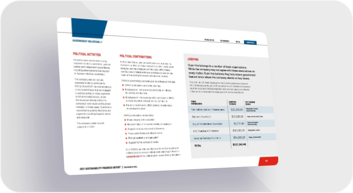 2021 SUSTAINABILITY PROGRESS REPORT | Cummins Inc. 64 LOBBYING Cummins belongs to a number of trade organizations. While the company may not agree with these associations on every matter, Cummins believes they help ensure government leaders know where the company stands on key issues. This chart lists U.S. trade organizations that Cummins paid dues in excess of $50,000 during calendar year 2021, as well as the U.S. Chamber of Commerce, which fell below that $50,000 threshold. Listed with each group is an estimate of the portion of dues used for lobbying or other political expenditures. TRADE ORGANIZATION LOBBYING ESTIMATE KEY CUMMINS ISSUES National Association of Manufacturers $32,803.60 Immigration, trade, manufacturing Business Roundtable $75,000.00 Trade, environment, taxes Engine Manufacturers Association $4,722.96 Truck and engine manufacturing U.S. Chamber of Commerce $10,000.00 Immigration, taxes American Trucking Association $14,815.92 Trade, environment TOTAL $127,342.48 POLITICAL CONTRIBUTIONS In the United States, political contributions are made by the Cummins Inc. Political Action Committee (CIPAC) and funded solely by voluntary employee contributions. CIPAC makes contributions to federal and state candidates on a bipartisan basis and according to federal and state election laws. CIPAC is governed by corporate policies and bylaws that state: CIPAC contributions are strictly voluntary. Employees will not be reimbursed directly or indirectly for political contributions. Employees will not be pressured to contribute to CIPAC or make any other personal political contribution. Failure to contribute to CIPAC shall not disadvantage an employee’s career. CIPAC contributions are based on: Public integrity of the candidate. Representation of a Cummins facility or employees. Support for issues important to Cummins. Timely and effective constituent service. Political leadership or organization. Support for the company’s values. All of CIPAC’s activities are disclosed to the Cummins Board of Directors in an annual political contribution report. Here’s a complete list of the political action committee’s contributions. POLITICAL ACTIVITIES Cummins bans contributions using corporate funds to candidates, political parties and independent expenditures, including advertisements that support or oppose individual candidates. The company also will not use corporate funds to contribute to 501 (c) (4) and 527 tax-exempt groups in the United States that are engaged in political activity or make payments to influence ballot issues, unless the issues are directly tied to the company’s core values and business interests. In those cases, Cummins is committed to publicly disclosing any payments including recipient names and amounts. The company made no such payments in 2021. GOVERNMENT RELATIONS //
