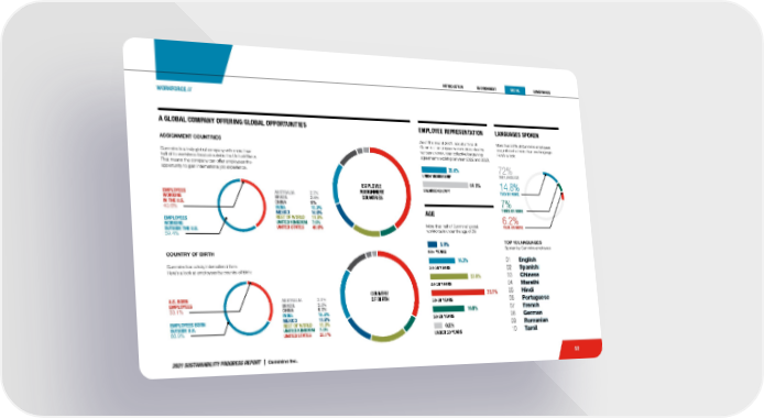 2021 SUSTAINABILITY PROGRESS REPORT | Cummins Inc. 52 AUSTRALIA 2.7% BRAZIL 2.6% CHINA 9% INDIA 15.3% MEXICO 10.6% REST OF WORLD 11.6% UNITED KINGDOM 7.6% UNITED STATES 40.6% AUSTRALIA 2.1% BRAZIL 2.8% CHINA 9.7% INDIA 18.4% MEXICO 11.6% REST OF WORLD 15.3% UNITED KINGDOM 7.0% UNITED STATES 33.1% 01 English 02 Spanish 03 Chinese 04 Marathi 05 Hindi 06 Portuguese 07 French 08 German 09 Romanian 10 Tamil A GLOBAL COMPANY OFFERING GLOBAL OPPORTUNITIES U.S. BORN EMPLOYEES 33.1% EMPLOYEES BORN OUTSIDE U.S. 66.9% 64.6% 35.4% UNION MEMBERSHIP SALARIED/EXEMPT EMPLOYEE REPRESENTATION As of the end of 2021, about a third of Cummins’ employees were represented by various unions under collective bargaining agreements expiring between 2022 and 2026. 16.3% 23.8% 5.9% 60+ YEARS 50-59 YEARS 40-49 YEARS AGE More than half of Cummins’ global workforce is under the age of 39. LANGUAGES SPOKEN More than 20% of Cummins employees are proficient at more than one language. Here’s a look: 6.2% FOUR OR MORE 7% THREE OR MORE 14.8% TWO OR MORE 72% ONE LANGUAGE TOP 10 LANGUAGES Spoken by Cummins employees ASSIGNMENT COUNTRIES Cummins is a truly global company with more than half of its workforce located outside the United States. That means the company can offer employees the opportunity to gain international job experience. COUNTRY OF BIRTH Cummins has a truly international flare. Here’s a look at employees by country of birth: EMPLOYEES WORKING IN THE U.S. 40.6% EMPLOYEES WORKING OUTSIDE THE U.S. 59.4% WORKFORCE // EMPLOYEE ASSIGNMENT COUNTRIES COUNTRY OF BIRTH 33.7% 30-39 YEARS 19.8% 20-29 YEARS 0.5% UNDER 20 YEARS