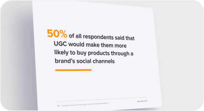 50% of all respondents said that UGC would make them more likely to buy products through a brand’s social channels 13 | Curalate Consumer Survey: Social Content is the New Storefront November 2017