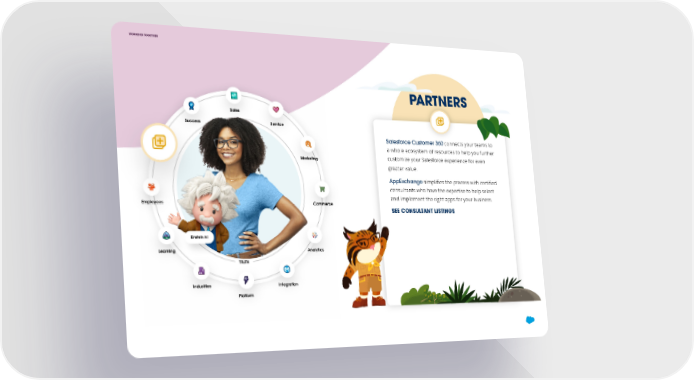 WORKING TOGETHER PARTNERS Sales Success Service Salesforce Customer 360 connects your teams to a whole ecosystem of resources to help you further Partners Marketing customize your Salesforce experience for even greater value. AppExchange simplifies the process with certified consultants who have the expertise to help select and implement the right apps for your business. Emloyees Commerce SEE CONSULTANT LISTINGS Einstein AI Learning Analytics TRUTH Industries Integration Platform
