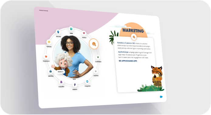 WORKING TOGETHER MARKETING Sales Success Service Salesforce Customer 360 enhances customer relationships by delivering personalized campaigns Partners Marketing and journeys with intelligent marketing automation. AppExchange campaign planning and management apps keep the data at your fingertips so you can increase customer engagement with ease. Emloyees Commerce SEE APPEXCHANGE APPS Einstein AI Learning Analytics TRUTH Industries Integration Platform