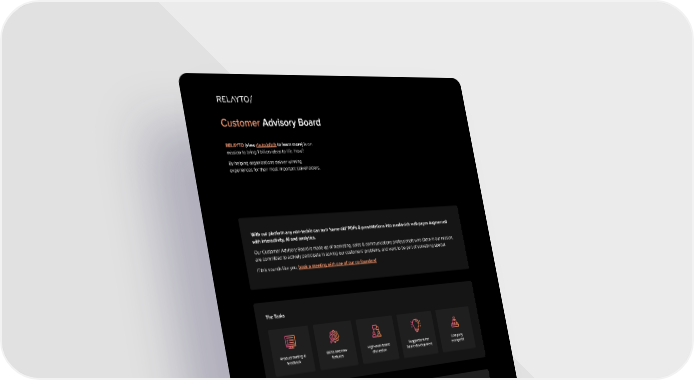 Customer Advisory Board RELAYT O (view rla.to/pitch to learn more) is on missi on to bring 1 billion ideas to life. How? By helping organizations deliver winning experiences for their most important stakeholders. The Tasks Product testing & feedback BETA test new features High-level board discussion Suggestions for future development Company evangelist The Benefits Bring 1 billion ideas to life Be part of a BIG mission Equity/ ownership (optional) High-growth award-winning startup Advisory board member Clients that Trust RELAYTO Interested? Next step: Book a meeting with one of our co-founders Lets Talk With our p latform any non-techie can turn same-old PDFs & presentations into media-rich web pages augmented with interactivity, AI and analytics. Our Customer Advisory Board is made up of marketing, sales & communications professionals who share in our mission, are committed to actively participate in solving our customers problems, and want to be part of something special. If this sounds like you, book a meeting with one of our co-founders!