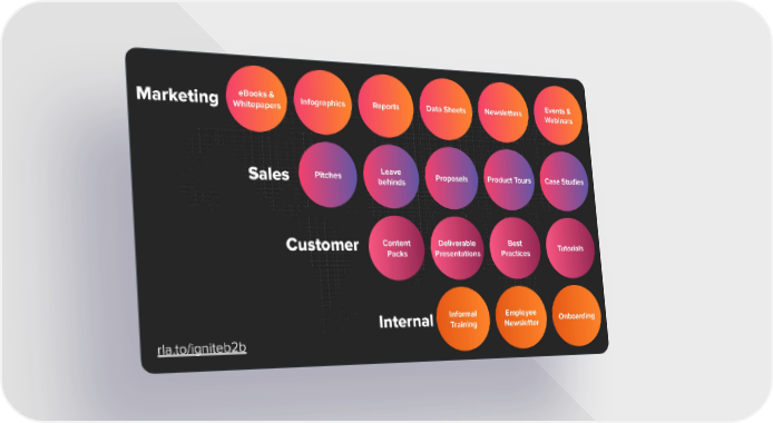 eBooks & Events & Infographics Reports Data Sheets Newsletters Marketing Whitepapers Webinars Leave Pitches Proposals Product Tours Case Studies Sales behinds Content Deliverable Best Customer Tutorials Packs Presentations Practices Informal Employee Onboarding Internal Training Newsletter rla.to/igniteb2b
