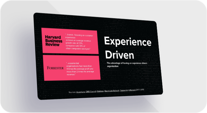 “…brands focusing on customer experience achieve an average revenue Experience growth rate of 23%, compared with 13% of other companies surveyed.” Driven The advantage of having an experience driven “…experiential organizations had more than organization 4 times the average profit and more than 2 times the average revenue.” Sources: Accenture, CMO Council, Edelman, Blackhawk Network, Capgemini, InMoment (2017–2018)