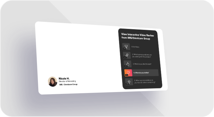 View Interactive Video Review from IMS/Omnicom Group 1. Full Video 05:06 2. What business problems are you solving with the product? 01:27 3. What do you like the best? 01:33 4. What do you dislike? 00:22 Nicole H. Director of Marketing 5. What recommendations do you have for others considering? IMS / Omnicom Group 01:06