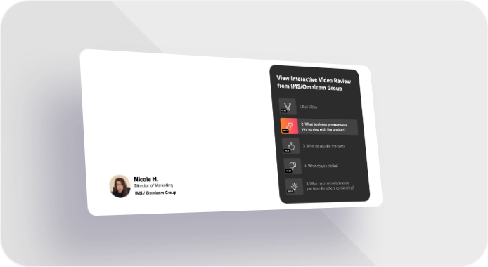 View Interactive Video Review from IMS/Omnicom Group 1. Full Video 05:06 2. What business problems are you solving with the product? 01:27 3. What do you like the best? 01:33 4. What do you dislike? 00:22 Nicole H. Director of Marketing 5. What recommendations do you have for others considering? IMS / Omnicom Group 01:06