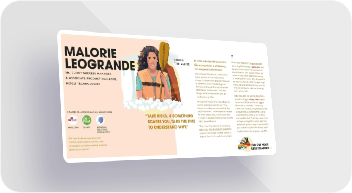 19 MALORIE RI DI NG I n 2018, Malorie's life took a turn. When presented with the opportunity to THE RAPIDS Like a pro paddler in whitewater, demo Mogli SMS during a Demo Jam, Mal she navigated it with finesse. thought of her musical roots and went in LEOGRANDE a bold direction . She rapped. "I knew the She had spent 15 years as a professional power of song when it comes to learning SR. CLIENT SUCCESS MANAGER singer, and was on the lookout for a or retaining information. Why do you think & ASSOCIATE PRODUCT MANAGER, change of course when she was introduced we teach our kids the ABCs through song? to Salesforce. She immediate ly got on I knew we were on to something, so that's MOGLI TECHNOLOGIES Trailhead and began the quest to ad min when we decided to take the risk and go certification. She became a Trailhead for it," advises Mal. Ranger within three months, and got Since then, Mal has won multiple Demo certified shortly after. Jams, including the Mega Demo Jam at Through the Power of Us Hub, Mogli, her Dreamforce 2019, which is the biggest current employer, reached out. ''They Demo Jam in the world. "Like a song, helped me realize my potential that day, a demo is a shared journey between artist FAVORITE APPE XCHANGE SOLUTION S and that's when I knew they were the right and audience. I wanted to find a way to "TAKE RISKS. IF OMETHING fit . A few weeks later, I received an offer. understand the stories of our audience I moved to Boulder, Colorado, two months and speak to that. That's why we continue SCARES YOU, T KE THE TIME later," shares Malorie. writing a variety of Demo Jam raps. Your MOGLI SMS COPILOT ELEVATION TO UNDERSTAND WHY." "Take risks, "she advises. "If something audience is going to vary, so why shouldn't SOLUTIONS scares you, take the time to understand your content? I guess '90s hip hop is just (CONSULTANT) my Demo Jam love language," says Mal. why and realize that it's often costlier to "We have firsthand experience with stay put than it is to push the envelope." CoPilot, which enables a holistic view of students so that we can help students skyrocket to success." FIND OUT MORE ABOUT MALORIE
