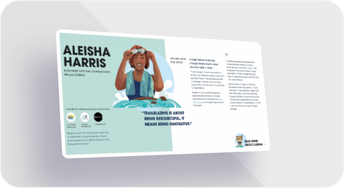 13 = ALEISHA "Trailblazing is about being resourceful. DIVING INTO A single Salesforce training It means being innovative. It means THE DEEP changed Aleisha Harris' career. listening to your customers. I try to make She dove right in . Deep. empl oyees' lives easi er. If that's through HARRIS "I said to myself, 'I don't know what I'm automation, if that's through training, if BUSINESS SYSTEM CONSULTANT, doing, I don't have the answers, and I can't that's through selling Lightning, that's what say I don't know.' This was scary , but also I do," states Aleisha. WELL S FARGO a chal lenge. It pushed me to do more, Aleisha's advice is to get on Trail head, to go further, and see how far I could take the Salesforce learning platform. "I love it," says Aleisha. Trailhead . I'm very addicted. I have more Aleisha is now a certiifed Salesforce than 250 badges. I learned every thing advanced administrator, a full stack through Trail head. It wasn't when around web development certiifed from Fre� I ifrst started using Salesforce, but once and a Lightning Activation C ode Cam p , it came on board, I jumped right in. I think Champion. I was one of the ifrst to get to Ranger," she says. FAVORITE APPEXCHANGE SOLUTIONS "TRAILBLAZING S AB OUT C on frg Wo