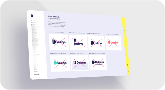 5. 1 Brand elements 7. Logo restrictions Brand positioning. BrB lays ensure you use the master logo artor and Guidelinera n The story of start. supplied and never edit the alenys logo in any d g ay. This is to promote „rand recognition and u i Brand elements. d ensure consistency across all applications. e Our logo. l i n Logo clearspace & minimum sizes. se Logo restrictions. s Logo placement. Natixis Payment endorsement. Colour palette. Do not: lter the proportions of the logo Do not: €dit the monogram or logotype locup Do not: Change the logotype typeface Do not: Only colour the logo in hite or navy Colour usage. Primary typography. System typography. Tone of voice. Language themes. Language stac. Tagline. Cover graphic device. ivider graphic device. ody graphic device. mage graphic device. raphic device detail. ero photography. Sector photography. Team photography. evice mocups. conography. nnotations. nfographics. llustrations. Stories of start. Charting. Do not: Separately recolour the monogram Do not: Place the logo over to colours Do not: use the "By Natixis Payment" endorsement Exemplar applications. PoerPoint. €mailers. Case study. T‚shirts. ƒoller „anners. …ision „oo. †lash cards . Note„oo. Version 1.8 | February 2021 €mail signature. usiness cards. V ‡ord document. er Tote „ag. sion 1. Lanyards. €namel pin. 8 | Get in touch. F eb 2021 dalenys.com