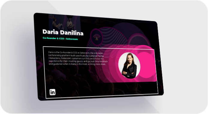 Daria Danilina Co-founder & CCO • Salesroom Daria is the Co-founder & CCO at Salesroom, the only video conferencing platform built specifically for customer-facing interactions. Salesroom customers can fully personalise the experience for their meeting guests and get real-time feedback and guidance when it matters the most, winning more deals.