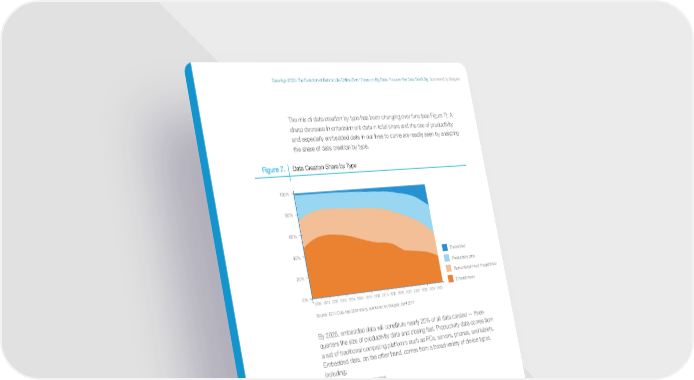 Data Age 2025: The Evolution of Data to Life-Critical Don’t Focus on Big Data; Focus on the Data That’s Big Sponsored by Seagate The mix of data creation by type has been changing over time (see Figure 7). A sharp decrease in entertainment data in total share and the rise of productivity and especially embedded data in our lives to come are readily seen by analyzing the share of data creation by type. Figure 7. Data Creation Share by Type 100% 80% 60% 40% Embedded 20% Productivity data Non-entertainment image/video 0% Entertainment 2010 2011 2012 2013 2014 2015 2016 2017 2018 2019 2020 2021 2022 2023 2024 2025 Source: IDC’s Data Age 2025 study, sponsored by Seagate, April 2017 By 2025, embedded data will constitute nearly 20% of all data created — three- quarters the size of productivity data and closing fast. Productivity data comes from a set of traditional computing platforms such as PCs, servers, phones, and tablets. Embedded data, on the other hand, comes from a broad variety of device types, including: • Security cameras • Smart meters • Chip cards • RFID readers • Fueling stations • Building automation • Smart infrastructure • Machine tools • Automobiles, boats, planes, busses, and trains • Vending machines • Digital signage • Casinos • Wearables • Medical implants • Toys IDC White Paper © 2017 IDC. www.idc.com | Page 13