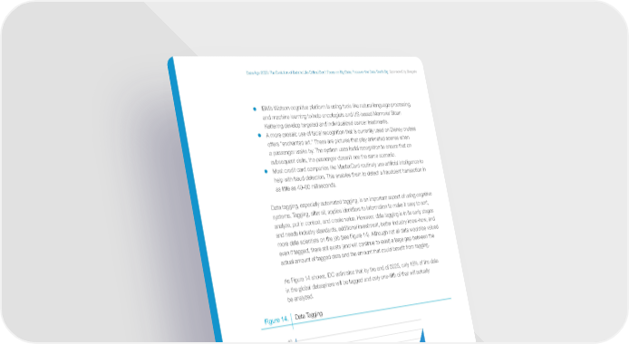 Data Age 2025: The Evolution of Data to Life-Critical Don’t Focus on Big Data; Focus on the Data That’s Big Sponsored by Seagate • IBM’s Watson cognitive platform is using tools like natural language processing and machine learning to help oncologists and US-based Memorial Sloan Kettering develop targeted and individualized cancer treatments. • A more prosaic use of facial recognition that is currently used on Disney cruises offers “enchanted art.” These are pictures that play animated scenes when a passenger walks by. The system uses facial recognition to ensure that on subsequent visits, the passenger doesn’t see the same scenario. • Most credit card companies like MasterCard routinely use artificial intelligence to help with fraud detection. This enables them to detect a fraudulent transaction in as little as 40–60 milliseconds. Data tagging, especially automated tagging, is an important aspect of using cognitive systems. Tagging, after all, applies identifiers to information to make it easy to sort, analyze, put in context, and create value. However, data tagging is in its early stages and needs industry standards, additional investment, better industry know-how, and more data scientists on the job (see Figure 14). Although not all data would be valued even if tagged, there still exists (and will continue to exist) a large gap between the actual amount of tagged data and the amount that could benefit from tagging. As Figure 14 shows, IDC estimates that by the end of 2025, only 15% of the data in the global datasphere will be tagged and only one-fifth of that will actually be analyzed. Figure 14. Data Tagging 40 35 30 25 20 Useful if Tagged Zettabytes15 Tagged 10 Analyzed 5 Touched by Cognitive Analytics 2010 2011 2012 2013 2014 2015 2016 2017 2018 2019 2020 2021 2022 2023 2024 2025 Source: IDC’s Data Age 2025 study, sponsored by Seagate, April 2017 IDC White Paper © 2017 IDC. www.idc.com | Page 20