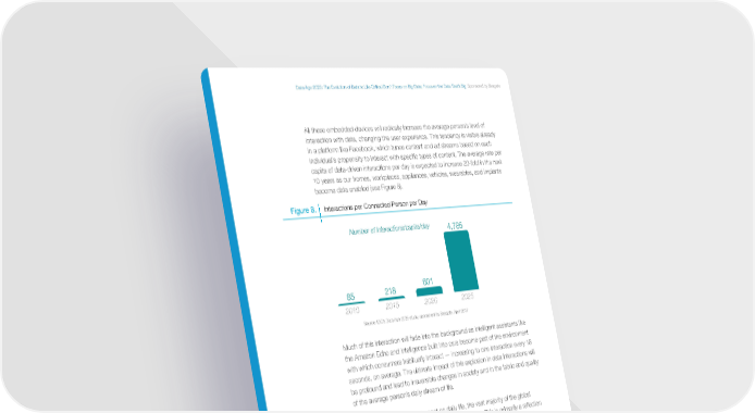 Data Age 2025: The Evolution of Data to Life-Critical Don’t Focus on Big Data; Focus on the Data That’s Big Sponsored by Seagate All these embedded devices will radically increase the average person’s level of interaction with data, changing the user experience. This tendency is visible already in a platform like Facebook, which tunes content and ad streams based on each individual’s propensity to interact with specific types of content. The average rate per capita of data-driven interactions per day is expected to increase 20-fold in the next 10 years as our homes, workplaces, appliances, vehicles, wearables, and implants become data enabled (see Figure 8). Figure 8. Interactions per Connected Person per Day Number of interactions/capita/day 4,785 85 218 601 2010 2015 2020 2025 Source: IDC’s Data Age 2025 study, sponsored by Seagate, April 2017 Much of this interaction will fade into the background as intelligent assistants like the Amazon Echo and intelligence built into cars become part of the environment with which consumers habitually interact — increasing to one interaction every 18 seconds, on average. The ultimate impact of this explosion in data interactions will be profound and lead to irreversible changes in society and in the fabric and quality of the average person’s daily stream of life. Despite having a profound impact on daily life, the vast majority of the global datasphere is used and discarded rather than stored. This is primarily a reflection of the fact that most data is fundamentally disposable once it has been used or transferred. To go back to the earlier example of streaming video, there is no reason to store the content of each individual streaming session for the same program. Here is where metadata comes into play. The streaming service needs to retain merely the knowledge of that specific video-viewing event. This knowledge can be reasonably sophisticated, including when and for how long the show was paused or fast- forwarded and whether or not the viewer watched the full show and on which device (or devices). Nonetheless, this metadata — the set of data potentially useful to the IDC White Paper © 2017 IDC. www.idc.com | Page 14