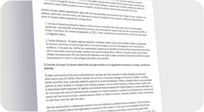 power, water, and sanitation to our locations. We expect that weather events such as hurricanes and wildfires will manifest in locations where risk to these hazards was historically low and there may not be sufficient capabilities or infrastructure to withstand the impact of such hazards. 2. Chronic physical risks: While we consider acute physical risks to be the “shocks” of anticipated extreme weather, chronic physical risks represent stressors to the system over time. In particular, extreme heat and sea level rise represent important chronic physical risks to DaVita. According to the National Institutes of Health, extreme heat may accelerate patient comorbidities due to the effects of heat stress, which may be a particular concern for dialysis patients. While DaVita’s locations are largely unexposed to coastal flood hazards today, expected sea level rise will change this picture in the future. Daily tidal flooding in coastal areas will likely reduce the ability for patients to reach DaVita locations, even in DaVita’s physical locations that are less exposed to this risk. DaVita’s climate-related opportunities align with our long-standing commitment to our Trilogy of Care: caring for our patients, each other and the world, and represent an area of strength for the company. DaVita has identified two areas of climate-related opportunity, among others: 1. Emissions Reduction Activities: Reduce GHG emissions consistent with approved science-based targets; specifically, reducing 50% of operational emissions and ensuring that supply chain partners representing 70% of Scope 3 emissions set climate change goals by 2025. These commitments could help the world limit warming to 1.5 degrees Celsius. 2. Facility Resilience: Through ongoing evaluation of climate-related risks to our facilities, DaVita is positioned to improve continuity of care through better informed emergency and risk management and investments in resiliency. In the past year, DaVita has experienced impacts to our facilities primarily driven by extreme rain events, which overwhelm local stormwater systems and cause flooding within facilities. Using the results of the facility climate risk assessment, EM and DaVita will determine how best to align operational protocols and facility capital improvements in order to help mitigate identified vulnerabilities. B. Describe the impact of climate-related risks and opportunities on the organization’s businesses, strategy, and financial planning. To date, acute physical risks such as flooding from extreme rain have resulted in facility damage and business interruption costs for DaVita. When extreme rain events or hurricanes damage and flood our facilities, resulting facility downtime may impact the ability for patients to receive treatments. If there is limited ability to accommodate patients at other facilities or through home dialysis programs, the increased frequency of flood events could result in diminished health outcomes for patients and adverse financial impacts for DaVita. Based on current estimates, we do not expect the costs of potential facility damage and missed treatments resulting from flooding from extreme rain events and hurricanes to have a material adverse effect on DaVita’s business, financial condition, results of operation or cash flows over the next five years. We see opportunities in addressing transition risks and reducing our global emissions footprint. GHG emissions reduction projects reduce the organization’s exposure to fluctuations in the costs and availability of fossil fuels. Further, there are opportunities to enhance our operational resiliency as we help to ensure that supply chain partners are managing their own risk exposure to help prevent future supply chain disruptions. These and other risks associated with delivery of essential medical supplies are considered in our procurement strategy: our procurement team evaluates a vendor’s ability to provide medical supplies in a range of situations with climate-related risks, including pandemics exacerbated by climate change and severe weather events. Our procurement team works closely with EM to help ensure that supplies are available for centers effected by severe weather events including flooding, fires, and severe storms. 32 DAVITA.COM/COMMUNITYCARE ESG DATA TABLES—SASB METRICS AND TCFD REPORT