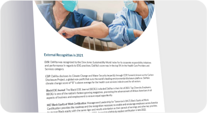 External Recognition in 2021 DJSI: DaVita was recognized by the Dow Jones Sustainability World Index for its corporate responsibility initiatives and performance in regards to ESG practices. DaVita’s score was in the top 5% in the Health Care Providers and Services category. CDP: DaVita discloses its Climate Change and Water Security impact(s) through CDP, formerly known as the Carbon Disclosure Project, a global non-profit that runs the world’s leading environmental disclosure platform. DaVita’s climate change score of “B” is above average for the health care services industry and for all sectors. Black EOE Journal: The Black EOE Journal (BEOEJ) included DaVita in their list of 2021 Top Diversity Employers. BEOEJ is one of the nation’s fastest-growing magazines, promoting the advancement of African Americans in all aspects of business and employment to ensure equal opportunity. MLT Black Equity at Work Certification: Management Leadership for Tomorrow’s (MLT) Black Equity at Work Certification provides the roadmap and the recognition necessary to enable and encourage employers across America to pursue Black equity with the same rigor and results orientation as their pursuit of earnings and other key priorities. DaVita achieved “Plan Approved” status in 2021, becoming eligible to receive certification in late 2022. HRC Corporate Equality Index: The Human Rights Campaign Foundation’s Corporate Equality Index is the national benchmarking tool on corporate policies, practices and benefits pertinent to lesbian, gay, bisexual, transgender and queer employees. DaVita scored 85/100 points, acknowledging practices and policies to support belonging for LGBTQ teammates. Healthiest Workplaces in America: DaVita was awarded the Healthiest 100 Workplaces in America award for the 2021 nomination period, signaling our commitment to employee health and wellbeing. 16 DAVITA.COM/COMMUNITYCARE 2021 HIGHLIGHTS