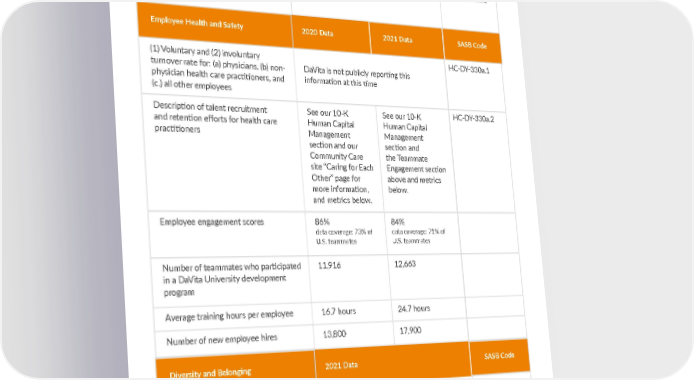 Caring for Each Other (1) Total recordable incident rate (TRIR) and (2) days away, restricted, or transferred (DART) rate DaVita is not publicly reporting this information at this time Employee Health and Safety 2021 Data SASB Code HC-DY-0320a.1 Employee Health and Safety 2020 Data SASB Code 2021 Data (1) Voluntary and (2) involuntary turnover rate for: (a) physicians, (b) non- physician health care practitioners, and (c.) all other employees DaVita is not publicly reporting this information at this time HC-DY-330a.1 Description of talent recruitment and retention efforts for health care practitioners See our 10-K Human Capital Management section and our Community Care site “Caring for Each Other” page for more information, and metrics below. HC-DY-330a.2 Employee engagement scores 86% data coverage: 73% of U.S. teammates See our 10-K Human Capital Management section and the Teammate Engagement section above and metrics below. 84% data coverage: 71% of U.S. teammates Number of teammates who participated in a DaVita University development program 11,916 12,663 Average training hours per employee 16.7 hours 24.7 hours Number of new employee hires 13,800 17,900 EEO-1 Report Link Diversity and Belonging 2021 Data SASB Code Learn more information about our commitment to Diversity and Belonging here . 25 DAVITA.COM/COMMUNITYCARE ESG DATA TABLES—SASB METRICS AND TCFD REPORT