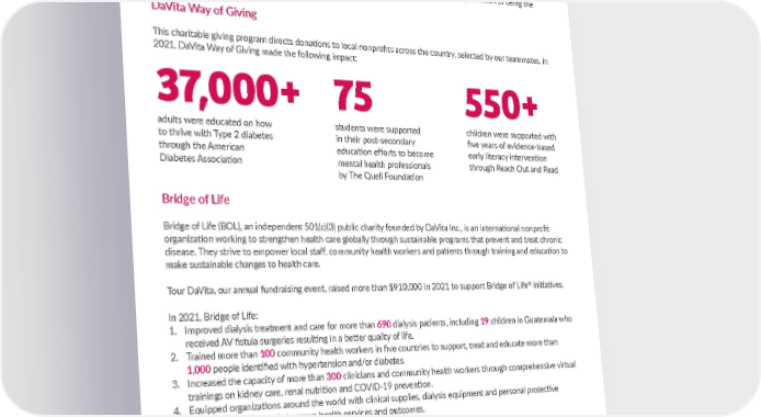 2021 ESG Initiatives: Healthy Communities DaVita Giving Foundation DaVita launched a new foundation in support of our ESG goals. DaVita Giving Foundation is a national, impact driven foundation focused in the areas of health care, social determinants of health, and kidney disease. The Foundation’s giving will reinforce and align with DaVita’s Core Values and ESG goals, driving the company’s mission of being the Provider, Partner and Employer of Choice. DaVita Way of Giving This charitable giving program directs donations to local nonprofits across the country, selected by our teammates. In 2021, DaVita Way of Giving made the following impact: Bridge of Life Bridge of Life (BOL), an independent 501(c)(3) public charity founded by DaVita Inc., is an international nonprofit organization working to strengthen health care globally through sustainable programs that prevent and treat chronic disease. They strive to empower local staff, community health workers and patients through training and education to make sustainable changes to health care. Tour DaVita, our annual fundraising event, raised more than $910,000 in 2021 to support Bridge of Life ® initiatives. In 2021, Bridge of Life: 1. Improved dialysis treatment and care for more than 690 dialysis patients, including 19 children in Guatemala who received AV fistula surgeries resulting in a better quality of life. 2. Trained more than 100 community health workers in five countries to support, treat and educate more than 1,000 people identified with hypertension and/or diabetes. 3. Increased the capacity of more than 300 clinicians and community health workers through comprehensive virtual trainings on kidney care, renal nutrition and COVID-19 prevention. 4. Equipped organizations around the world with clinical supplies, dialysis equipment and personal protective equipment (PPE) to help improve health services and outcomes. Minority Lending Initiative In 2021, DaVita made a $15 million Transformational Deposit (TD) into HOPE Credit Union (HOPE) , which provides banking services and loans to underserved communities. The investment will support home and small business ownership opportunities for thousands of residents historically lacking financial service access in the southeastern United States. 14 DAVITA.COM/COMMUNITYCARE adults were educated on how to thrive with Type 2 diabetes through the American Diabetes Association children were supported with five years of evidence-based early literacy intervention through Reach Out and Read students were supported in their post-secondary education efforts to become mental health professionals by The Quell Foundation 37,000+ 75 550+ 2021 HIGHLIGHTS