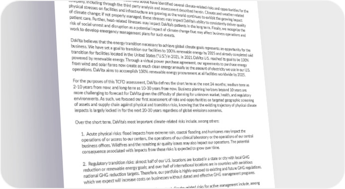 Strategy Disclose the actual and potential impacts of climate-related risks and opportunities on the organization’s businesses, strategy, and financial planning. A. Describe the climate-related risks and opportunities the organization has identified over the short, medium, and long term. The DaVita management teams described above have identified several climate-related risks and opportunities for the company, including through the third party analysis and assessment described herein. Climate and weather-related physical stresses on facilities and infrastructure are growing as the world continues to exhibit the growing impact of climate change; if not properly managed, these stresses may impact DaVita’s ability to consistently deliver quality patient care. Further, heat-related illnesses may impact DaVita’s patients in the long term. Finally, we recognize the risk of social unrest and disruption as a potential impact of climate change that may affect business operations and work to develop emergency management plans for such events. DaVita believes that the energy transition necessary to achieve global climate goals represents an opportunity for the business. We have set a goal to transition our facilities to 100% renewable energy by 2025 and already completed said transition for facilities located in the United States (“U.S.”) in 2021. In 2021 DaVita U.S. reached its goal to be 100% powered by renewable energy. Through a virtual power purchase agreement, our agreements to purchase energy from wind and solar farms now create as much clean energy annually as the amount of electricity we use in our U.S. operations. DaVita aims to accomplish 100% renewable energy procurement at all facilities worldwide by 2025. For the purposes of this TCFD assessment, DaVita defines the short term as the next 24 months; medium term as 2-10 years from now; and long-term as 10-30 years from now. Business planning horizons beyond 10 years are more challenging to forecast for DaVita given the difficulty of planning for unknown market, health, and regulatory environments. As such, we focused our first assessment of risks and opportunities on targeted geographic screening of assets and supply chain against physical and transition risks, knowing that the existing trajectory of physical climate impacts is largely locked in for the next 20-30 years regardless of global emissions scenarios. Over the short term, DaVita’s most important climate-related risks include, among others: 1. Acute physical risks: flood impacts from extreme rain, coastal flooding, and hurricanes may impact the operations of or access to our centers, the operations of our clinical laboratory or the operations of our central business offices. Wildfires and the resulting air quality issues may also impact our operations. The potential consequence associated with impacts from these risks is expected to grow over time. 2. Regulatory transition risks: almost half of our U.S. locations are located in a state or city with local GHG reduction or renewable energy goals; and over half of international locations are in countries with ambitious national GHG reduction targets. Therefore, our portfolio is highly exposed to existing and future GHG regulations, which we expect will increase costs on businesses without stated and effective GHG management programs. In the medium and long term, DaVita’s most important climate-related risks for active management include, among others: 1. Acute physical risks: as the effects of climate change continue to grow, DaVita’s exposure to the acute physical risks described in the short term will expand across its locations. The cumulative impact of repetitive damage may start to influence patient behavior and demographics (through climate-related migration and other factors) and may impact our ability to deliver services effectively. The growing prevalence of extreme weather events will likely place additional strain on electric power grids and physical infrastructure, disrupting the delivery of 31 DAVITA.COM/COMMUNITYCARE ESG DATA TABLES—SASB METRICS AND TCFD REPORT