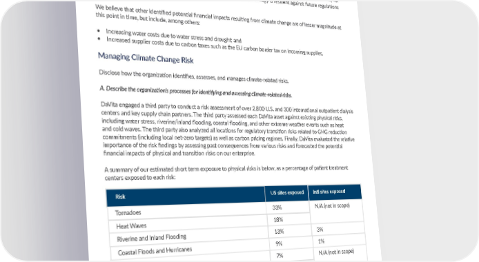 We have evaluated climate-related impacts for key suppliers to determine where we may need to build additional redundancy in our supply chain going forward. The COVID-19 pandemic has caused unprecedented challenges to supply chains. While many global supply chain challenges can be linked to the COVID-19 pandemic, others result from acute or chronic physical impacts such as winter storms, extreme rain and flood events, and tornadoes, among other things. We are assessing ways to build redundancy in our supply chain to help prepare for extreme weather events. In addition, we are working towards having suppliers representing 70% of our scope 3 emissions have also set GHG emissions targets. This goal is part of our approved science-based target and represents an opportunity for DaVita and its suppliers to be market leaders and help ensure that our strategy is resilient against future regulations and evolving market expectations. We believe that other identified potential financial impacts resulting from climate change are of lesser magnitude at this point in time, but include, among others: • Increasing water costs due to water stress and drought; and • Increased supplier costs due to carbon taxes such as the EU carbon border tax on incoming supplies. Managing Climate Change Risk Disclose how the organization identifies, assesses, and manages climate-related risks. A. Describe the organization’s processes for identifying and assessing climate-related risks. DaVita engaged a third party to conduct a risk assessment of over 2,800 U.S. and 300 international outpatient dialysis centers and key supply chain partners. The third party assessed each DaVita asset against existing physical risks, including water stress, riverine/inland flooding, coastal flooding, and other extreme weather events such as heat and cold waves. The third party also analyzed all locations for regulatory transition risks related to GHG reduction commitments (including local net-zero targets) as well as carbon pricing regimes. Finally, DaVita evaluated the relative importance of the risk findings by assessing past consequences from various risks and forecasted the potential financial impacts of physical and transition risks on our enterprise. A summary of our estimated short term exposure to physical risks is below, as a percentage of patient treatment centers exposed to each risk: While we believe that it is important for our facilities to be aware of their individual physical risk exposure and plan accordingly, we assign relative importance to each risk based on known past facility impacts, which is how we determined the most important potential risks for active management, detailed below. 33 DAVITA.COM/COMMUNITYCARE Tornadoes 33% Risk US sites exposed Intl sites exposed N/A (not in scope) Heat Waves 18% Riverine and Inland Flooding 13% 3% Coastal Floods and Hurricanes 9% 1% Cold Waves 7% N/A (not in scope) Wildfires 2% Drought/Water Stress 1% 10% ESG DATA TABLES—SASB METRICS AND TCFD REPORT