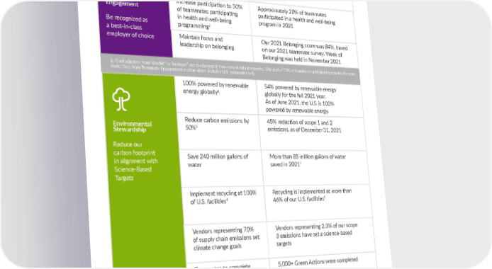 Category 2025 Goal 2021 Progress Teammate Engagement Provide learning and development programs to more than 95% of teammates each year More than 95% of teammates attended a learning and development program through our online suite of courses Increase participation to 50% of teammates participating in health and well-being programming 2 Approximately 20% of teammates participated in a health and well-being program in 2021 Environmental Stewardship 100% powered by renewable energy globally 1 54% powered by renewable energy globally for the full 2021 year. As of June 2021, the U.S. is 100% powered by renewable energy. Reduce carbon emissions by 50% 2 45% reduction of scope 1 and 2 emissions, as of December 31, 2021 Save 240 million gallons of water More than 85 million gallons of water saved in 2021³ Implement recycling at 100% of U.S. facilities 4 Recycling is implemented at more than 46% of our U.S. facilities 5 Vendors representing 70% of supply chain emissions set climate change goals Vendors representing 2.3% of our scope 3 emissions have set a science-based targets Teammates to complete 70,000 Green Actions 5,000+ Green Actions were completed in 2021 6 18 DAVITA.COM/COMMUNITYCARE Maintain focus and leadership on belonging Our 2021 Belonging score was 84%, based on our 2021 teammate survey. Week of Belonging was held in November 2021 2. Goal adjusted from “double” to “increase” due to changes in how vendor data is reported. Our goal of 50% of teammates participating remains the same. Note: Data from Teammate Engagement section above includes U.S. teammates only 1. Via on-site renewable energy and/or virtual Power Purchase Agreements 2. As compared to 2018 baseline 3. Calculated based on gallons per treatment savings from clinics with water efficiency projects implemented 4. Where local recycling is available and permitted at our premises 5. Includes domestic kidney care centers with confirmed recycling services 6. A Green Action is complete when any global teammate does something to improve the environment, reduce environmental impact, and/or learn something new or educate others about sustainability. 1 volunteer hour equates to 1 Green Action. Be recognized as a best-in-class employer of choice Reduce our carbon footprint in alignment with Science-Based Targets PROGRESS TOWARD OUR 2025 GOALS