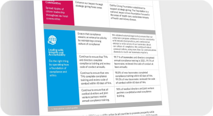 Category 2025 Goal 2021 Progress Leading with Integrity and Accountability Ensure that compliance remains an enterprise priority by maintaining a strong culture of compliance 1 Continue to ensure that TMs and directors complete compliance training and review code of conduct annually. 99.7 % of teammates and directors completed annual compliance training in 2021. 99.7% of teammates reviewed the code of conduct at least annually. Continue to ensure that new TMs complete compliance training and review code of conduct within 60 days of hire. 98.8% of new teammates completed compliance training within 60 days of hire. 99.0% of new teammates reviewed the code of conduct within 60 days of hire. Continue to ensure that all medical directors and joint venture partners receive annual compliance training. 96% of medical directors and joint venture partners completed annual compliance training. The Sustainable Development Goals (SDGs) are a call for action by all countries to promote prosperity while protecting the planet. In 2015, all United Nations Member States adopted 17 goals as part of the 2030 Agenda for Sustainable Development, which sets out a 15-year plan to achieve the SDGs. As a global citizen, DaVita is committed to helping reach these goals. Our 2025 goals align with several of the SDGs, including Goal 3: Good Health and Well-Being, Goal 8: Decent Work and Economic Growth and Goal 13: Climate Action. 19 DAVITA.COM/COMMUNITYCARE Healthy Communities 125,000 hours of volunteerism 8,900+ volunteer hours were completed in 2021 Enhance our impact through strategic giving focus areas DaVita Giving Foundation established to support strategic giving. The Foundation is a national, impact driven foundation focused in the areas of health care, social determinants of health and kidney disease. We obtained external input to help ensure that our compliance program continues to evolve consistently with industry best practices, and conducted an enterprise-wide survey of our teammates about our culture of compliance. We continued robust communications, using more than 32 communications channels to reach our teammates regularly. 1. New addition to 2025 goal list Spread ripples of citizen leadership throughout our local communities Do the right thing by operating from a foundation of compliance and ethics PROGRESS TOWARD OUR 2025 GOALS