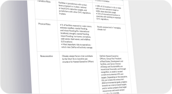 36 DAVITA.COM/COMMUNITYCARE DaVita produces an annual ESG report which details the climate-related metrics in use by the organization. DaVita finds the following metrics to be the most useful in driving meaningful organizational climate-related action: GHG Emissions Absolute Scope 1, 2, and 3 emissions Transition Risks Facilities in jurisdictions with carbon taxes proposed or in place, national or local GHG reduction targets, and jurisdictions with other GHG regulations in place. Physical Risks • % of facilities exposed to: water stress, extreme weather, coastal flooding, and inland flooding (for international locations); drought, coastal flooding, inland flooding, hurricanes, tornadoes, cold waves, heat waves, and wildfires (US locations) • Most important risks to operations - which risks DaVita will actively manage. Indicator Metrics Tracked 2021 KPIs Detailed in (b) below • 38% of US locations in city or state with net-zero emissions target or 100% clean electricity target • 55% of international locations in countries with existing or expected GHG regulations Results summarized in “managing climate risk” Remuneration Climate-related factors that contribute to the Short Term Incentive pay structure for Named Executive Officers DaVita’s Named Executive Officers, Group Vice President of Real Estate, Development and Facilities, and Senior Director of Energy and Sustainability are incentivized financially, and through recognition, to meet or exceed certain environmental KPIs and targets. Depending on the executive, this can include the enterprise’s 2025 environmental goals, progress towards our science-based targets, and/or various projects that target resource use and waste output reduction, for example. ESG DATA TABLES—SASB METRICS AND TCFD REPORT