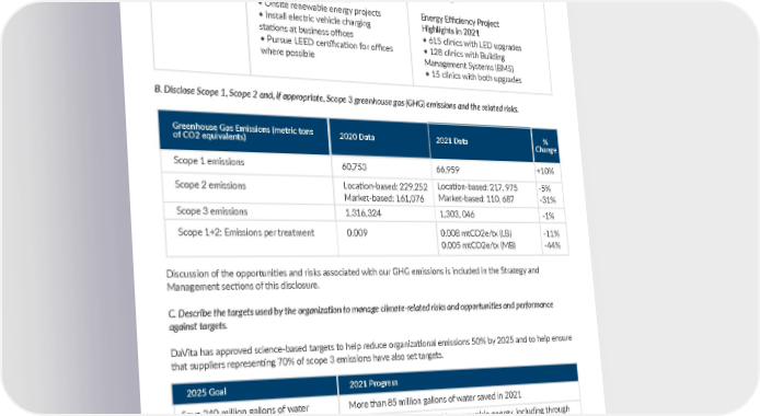 37 DAVITA.COM/COMMUNITYCARE Indicator Metrics Tracked 2021 KPIs Climate-Related Opportunities Percentage of renewable electricity across its operations in service of its 100% renewable 2025 goal. Reduce carbon emissions by 50% through initiatives such as: • Onsite renewable energy projects • Install electric vehicle charging stations at business offices • Pursue LEED certification for offices where possible DaVita’s U.S. locations are now powered by 100% renewable energy, through the use of virtual power purchase agreements, among other things. Energy Efficiency Project Highlights in 2021 • 615 clinics with LED upgrades • 128 clinics with Building Management Systems (BMS) • 15 clinics with both upgrades B. Disclose Scope 1, Scope 2 and, if appropriate, Scope 3 greenhouse gas (GHG) emissions and the related risks. Greenhouse Gas Emissions (metric tons of CO2 equivalents) 2020 Data % Change 2021 Data Scope 1 emissions 60,753 Scope 2 emissions Location-based: 229,252 Market-based: 161,076 Scope 3 emissions 1,316,324 Scope 1+2: Emissions per treatment 0.009 Discussion of the opportunities and risks associated with our GHG emissions is included in the Strategy and Management sections of this disclosure. C. Describe the targets used by the organization to manage climate-related risks and opportunities and performance against targets. DaVita has approved science-based targets to help reduce organizational emissions 50% by 2025 and to help ensure that suppliers representing 70% of scope 3 emissions have also set targets. Save 240 million gallons of water More than 85 million gallons of water saved in 2021 2025 Goal 2021 Progress 100% powered by renewable energy globally U.S. is now 100% powered by renewable energy, including through use of virtual power purchase agreements; 54% renewable globally Teammates to complete 70,000 green actions* 5,000+ Green Actions were completed in 2021 Implement recycling at 100% of U.S. facilities* Recycling is implemented at more than 46% of our U.S. facilities *where local recycling is available and permitted at our premises 0.008 mtCO2e/tx (LB) 0.005 mtCO2e/tx (MB) -11% -44% -1% -5% -31% +10% 1,303, 046 Location-based: 217, 975 Market-based: 110, 687 66,959 *A Green Action is complete when any global teammate does something to improve the environment, reduce environmental impact, and/or learn something new or educate others about sustainability. 1 volunteer hour equates to 1 Green Action. ESG DATA TABLES—SASB METRICS AND TCFD REPORT