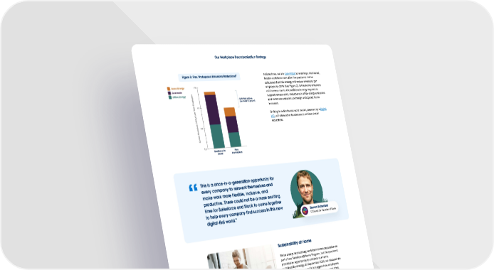 Our Workplace Decarbonization Strategy At Salesforce, we are committed to enabling a distributed, Figure 2: Flex Workspace Emissions Reductions2 flexible workforce even after the pandemic. We’ve calculated that this strategy will reduce emissions per employee by 29% (see Figure 2). While home emissions will increase due to the additional energy required to support remote work, reductions in office energy emissions and commute emissions outweigh anticipated home increases. Digital Shifting to a distributed work model, powered by a HQ , will allow other businesses to achieve similar reductions. This is a once-in-a-generation opportunity for every company to reinvent themselves and make work more flexible, inclusive, and productive. There could not be a more exciting time for Salesforce and Slack to come together to help every company find success in this new Stewart Butterfield digital-first world.” CEOand Co-Founder of Slack Sustainability at Home We’ve always had a strong work-from-home population as part of our Salesforce@Home Program, but the pandemic provided an opportunity to enhance our home sustainability strategy. In September 2020, we released the Sustainability at Home guide to suggest how employees could make their homes more comfortable, productive, and sustainable. In it, we share actionable ways employees can improve workspaces and the planet. While our office- and commute-related emissions significantly decreased during the pandemic, we know that emissions increased elsewhere as our employees shifted to working from home. To better understand the carbon footprint of working from home, we estimated the increase in employee home energy consumption through a survey conducted in February Net Zero 2021. As part of our commitment, we are developing carbon reduction programs for the home energy emissions measured in the survey. After reduction options are exhausted, we will compensate for remaining emissions by investing in high-quality carbon credits. Moving forward, we will continue to measure (and offset3) home energy emissions based on learning from further annual surveys. 2 Salesforce Stakeholder Impact Report 3 We follow a robust due diligence process to vet carbon credits before we procure them. For every potential carbon credit purchase, we apply a set of detailed criteria that are based on global best practices. We also work with qualified independent consultants and expert brokers to help guide us. 4 | Salesforce.com/sustainability
