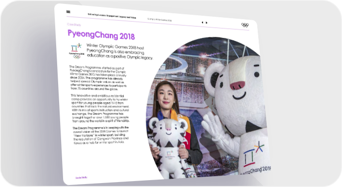 Delivering Success: Engagement, Legacy and Vision Olympic Winter Games 2026 Case Study PyeongChang 2018 Winter Olympic Games 2018 host PyeongChang is also embracing education as a positive Olympic legacy. The Dream Programme, started as part of PyeongChang’s candidature for the Olympic Winter Games 2010, has taken place annually since 2004. The programme has already helped spread Olympic values as well as offer winter sports experiences to participants from 75 countries around the globe. This innovative and ambitious residential camp provides an opportunity to try winter sport for young people aged 11-15 from countries that lack the natural environment. With its mix of sports instruction and cultural exchange, the Dream Programme has brought together over 1,500 young people from around the world in a spirit of friendship. The Dream Programme is in keeping with the overall vision of the 2018 Games to launch “New Horizons” in winter sport, building the reputation of Gangwon Province and Korea as a hub for winter sport in Asia. Social Unity 20