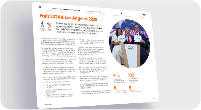 Delivering Success: Engagement, Legacy and Vision Olympic Winter Games 2026 Paris 2024 & Los Angeles 2028 One of the signi昀椀cant successes of the IOC’s Agenda 2020 has been the fact that the host cities for both 2024 and 2028 have proposed Games that will mark new levels of sustainability. As a starting point, both Paris and Los Angeles fully • Over 26 hectares of biodiversity created embraced the Olympic Agenda 2020 philosophy on the Olympic sites in Seine-Saint-Denis, that cities should use existing or temporary venues thanks to the Games if no long-term legacy need could be identi昀椀ed. Paris 2024 is also working to develop and As a result, both cities will deliver Games plans deliver a sustainable model of organising in which more than 90 per cent of venues will be major events that is reproducible existing or temporary – leading to signi昀椀cant cost internationally, and to share it with other reductions in organising the Games as well as international organisers. eliminating the risk of ‘white elephant’ developments. Meanwhile, Los Angeles will be the 昀椀rst The Paris bid was built around a strong commitment “energy-positive” Games, meaning more and vision for sustainable development in the energy will be generated through renewable broadest sense. The candidature team stated: sources than is needed to power the Games. “Building on the Paris Agreement on climate LA 2028 is already collaborating with venue change adopted in December 2015 at the COP21, partners to explore opportunities for onsite the Paris 2024 Games will be at the forefront of renewable energy generation, such as environmental stewardship.” solar carports. The Paris Olympic and Paralympic Village will be The Games in LA will also feature a Green Sports 97% 93% a model of sustainable development, including: Park, which will showcase leading technology of Los Angeles of Paris 2024 venues • 100 per cent bio-based materials in sport and environmental innovation. 2028 venues will be will be temporary • 100 per cent green energy during And an innovative new role has been created temporary or existing or existing the Games to deliver and oversee all sustainability and • 100 per cent sustainable and certi昀椀ed legacy projects. food sources The Chief Impact Of昀椀cer, who will be a member of Read the Los Angeles Read the Paris • 100 per cent of the Olympic family and the executive team, will report directly to the CEO. Candidature File here Candidature File here spectators using clean transportation Sustainability 26
