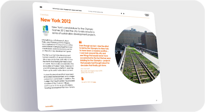 Delivering Success: Engagement, Legacy and Vision Olympic Winter Games 2026 Case Study New York 2012 New York’s candidature for the Olympic Games 2012 led the city to rally around a series of sustainable development projects. Mitchell Moss, a Professor of Urban Policy and Planning at NYU Wagner, has emphasised the importance of the Even though we lost, I view the effort candidature in bringing together major to bid for the Olympics for New York stakeholders and encouraging action to have been a massive positive… on the city’s key development goals. I can look around this city and The famous High Line development see things that would never have turned a section of unused rail track occurred but for the fact that we were into a new pedestrian park which is now the tenth most Instagrammed place bidding for the Olympics – projects on earth. The bid also accelerated the that people had thought about for decades that 昀椀nally got done. renovation of Hudson Yards, Greenpoint and Williamsburg waterfront, opening Dan Doctoroff them up to sustainable development. Bid Leader and Deputy Mayor (2001- Hudson Boulevard and Park have been 2008), New York 2012 renovated and expanded, and a major convention centre built. In addition, the Hunter’s Point South district, the proposed location of the Olympic Village, Read the full study here continues to thrive as an affordable housing development for New Yorkers. Sustainability 25